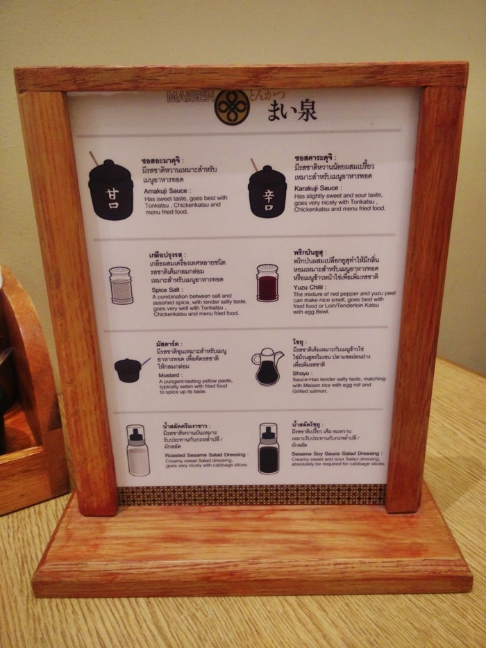 3.ซอส : คนญี่ปุ่นจะมีความเชื่อว่า สื่งที่เป็นส่วนสำคัญในการตัดสินรสชาติของทงคัตสึ คือซอส ซอสของไมเซนทำจากผลไม้และเครื่องเทศหลากหลายชนิด เรียกได้ว่าเฉพาะตัวสุดๆ โดยคุณเล็กเล่าเพิ่มเติมว่า ในสมัยก่อน เวลาเค้าทำซอส คนทำจะคัดสรรผลไม้สดใหม่มากมายมาทำซอส โดยหลังจากทำทุกครั้งจะมีการอธิษฐาน "ขอให้ซอสนี้อร่อยขึ้นเถอะ" จนได้เป็นซอสเอกลักษณ์ สูตรไมเซนสูตรนี้ออกมา