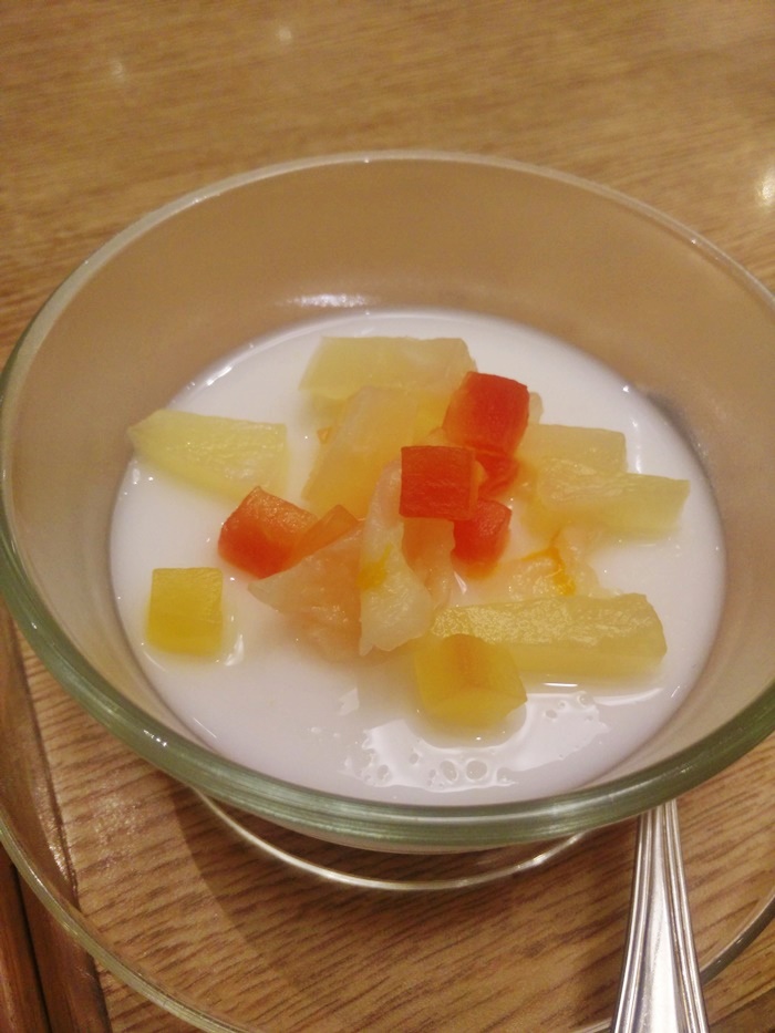 เมื่อของคาวบนโต๊ะทยอยหมดไป พนักงานเดินมาสอบถาม รับของหวานเลยไหมคะ มีให้เลือก 3 อย่าง เต้าฮวยฟรุตสลัด ไอศครีมชาเขียว และ อัลมอนด์คัสตาร์ด เป็นอันครบถ้วนทั้งคาวหวาน ปิดท้ายกันแบบฟิน ฟินเลยทีเดียว
