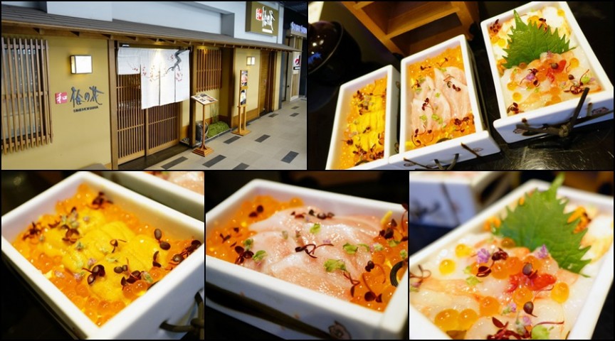 ชั้นแรกเป็น ไข่หอยเม่น (Uni) กับ ไข่ปลาแซลม่อน (Ikura) วางบนข้าว