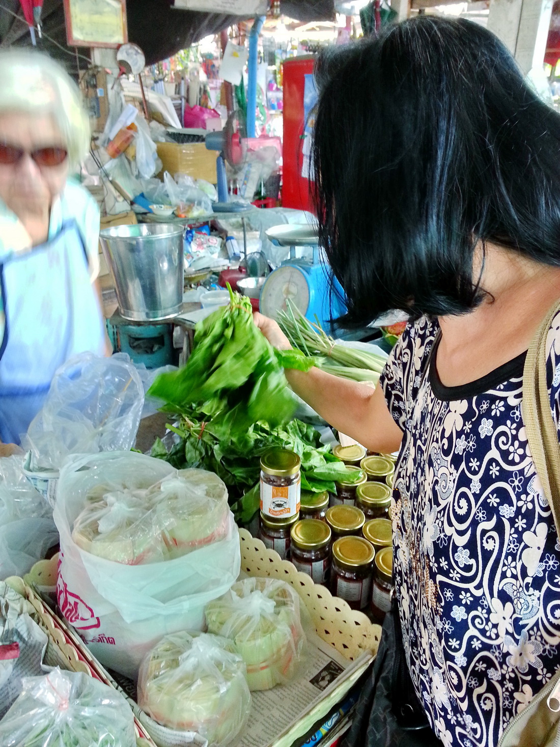 ลูกสาวกินหมูไปละ แต่คุณแม่นี่มาสายผักค่ะ ... (แวะทุกร้านขายผักบอกเลยยย) สามอย่างนี้ร้านเดียวนะคะ คุณยายคนขายบอกอยู่บ้านว่างๆ ก็เก็บนู่น ทำนี่ขาย