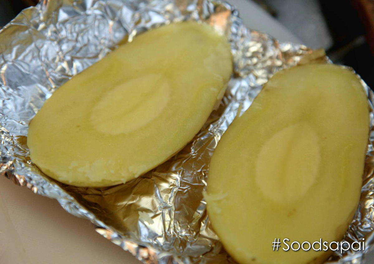 1. พี่หนุ่ยล้างและซับมันฝรั่งให้แห้ง ทาน้ำมันมะกอกที่ผิวเล็กน้อย แล้วห่อด้วยฟรอยห่ออาหาร นำไปอบจนสุก ใช้ไม้จิ้มฟันเทสดูค่ะ ของหนุ่ยใช้ไฟ 220 องศา เวลา 20นาที พอสุกนำมาผ่าครึ่งควักไส้ออกเหลือเนื้อติดเปลือก พอให้อยู่ทรง นำเนื้อมันที่ได้มาบดค่ะ พักไว้