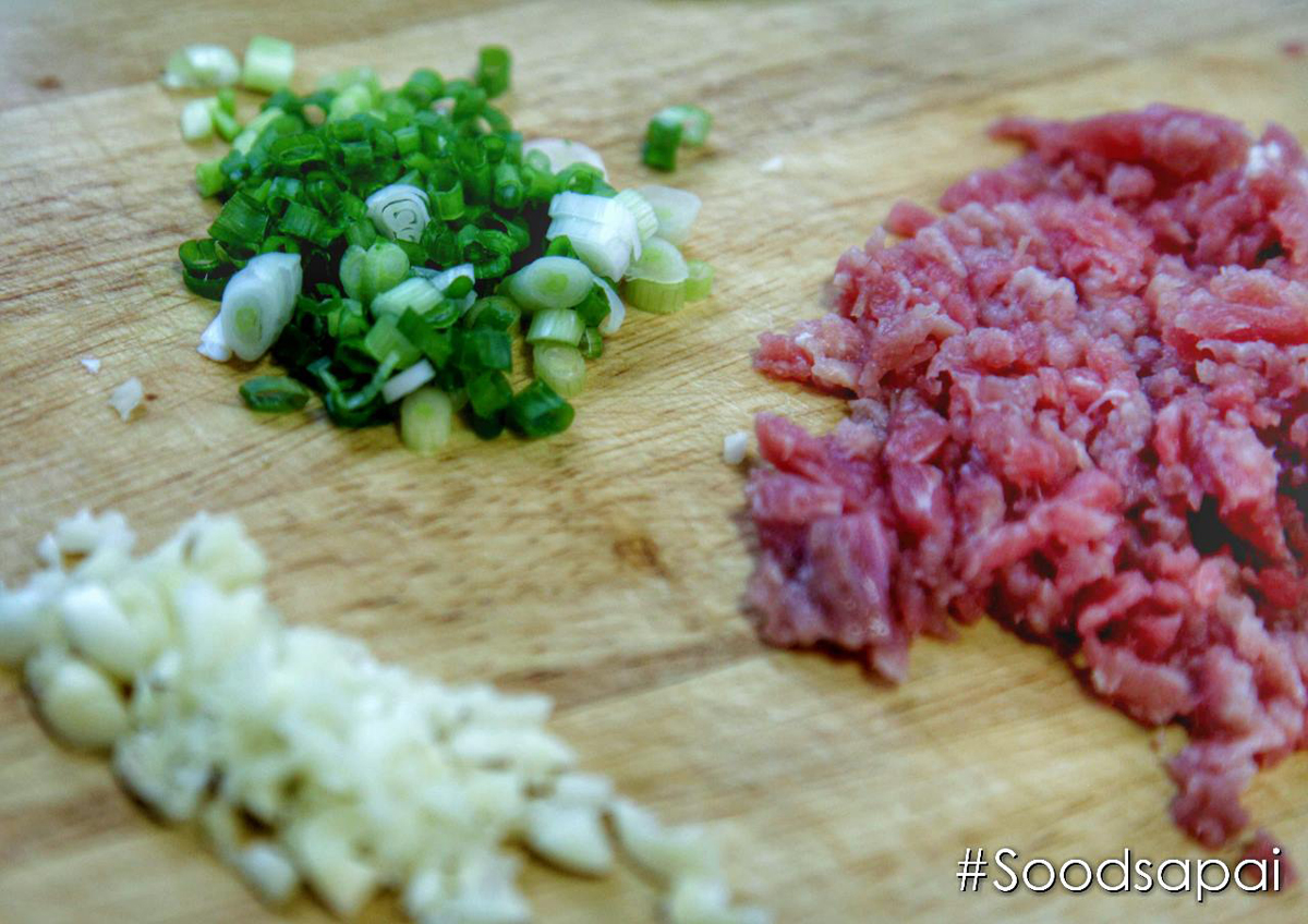 2.ตั้งกะทะไฟกลาง พอร้อนใส่เนย พอเนยละลายใส่กระเทียมสับพอหอมใส่หมูสับลงผัด ตามด้วยมันฝรั่งที่บดไว้ ปรุงรสด้วยเกลือ พริกไทย พอได้รสตามชอบใส่ต้นหอมซอย ปิดไฟ