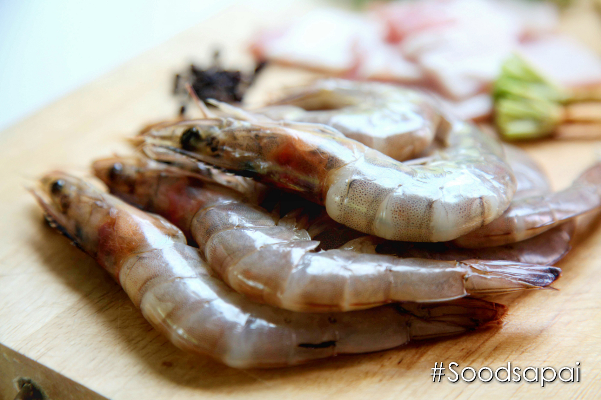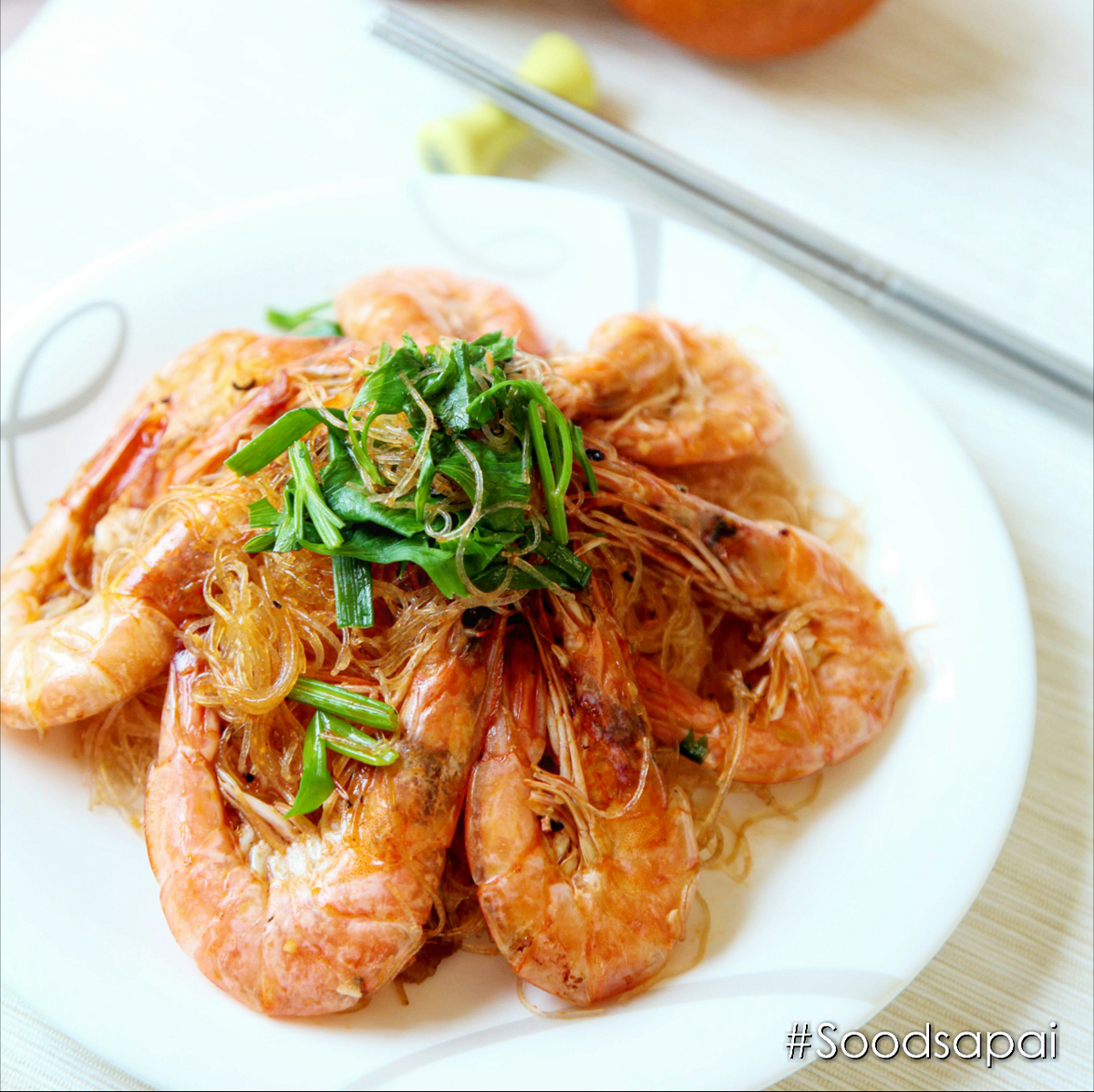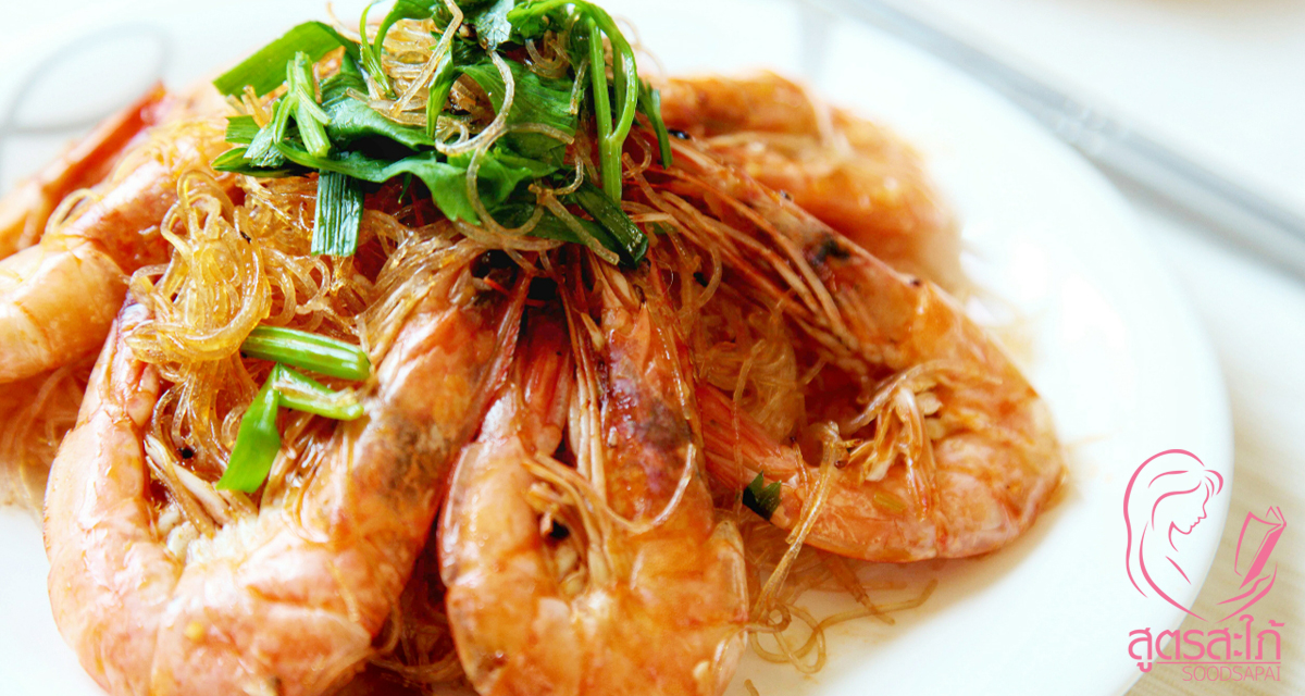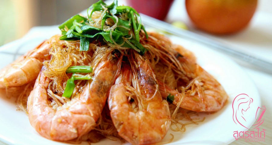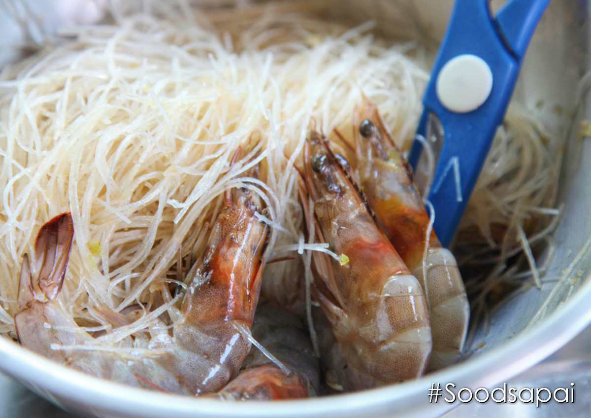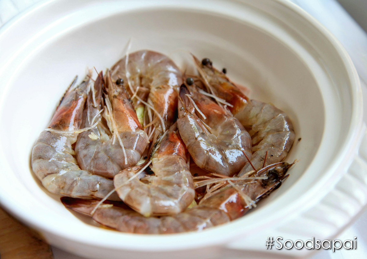 4. นำกุ้งตัดหนวดล้างสะอาด ไม่ต้องแกะเปลือกนะคะ ใส่รวมกับวุ้นเส้นแล้วเทน้ำเครื่องปรุงคลุกเคล้าให้เข้ากัน จากนั้น แยกกุ้งวางลงในหม้อดินก่อน แล้วค่อยตามด้วยวุ้นเส้นค่ะ