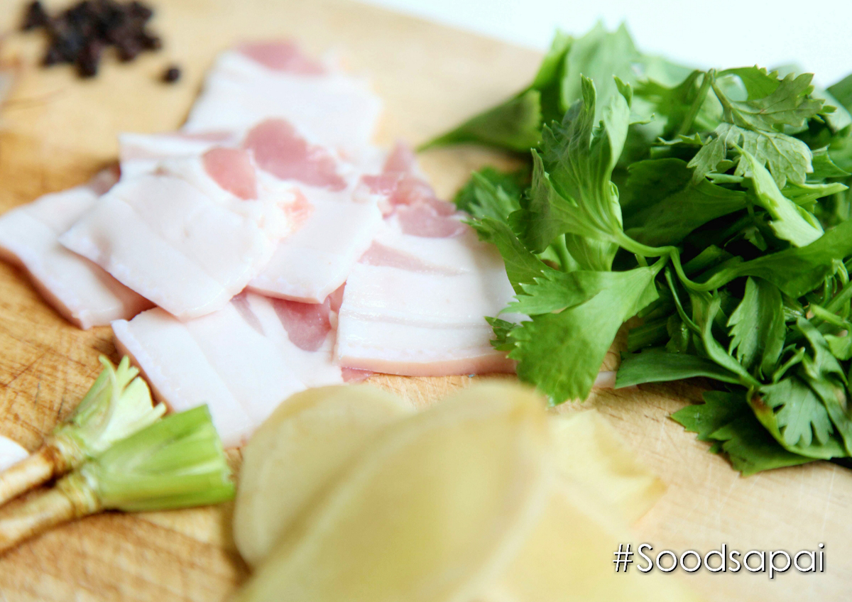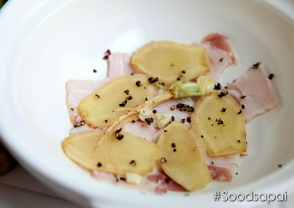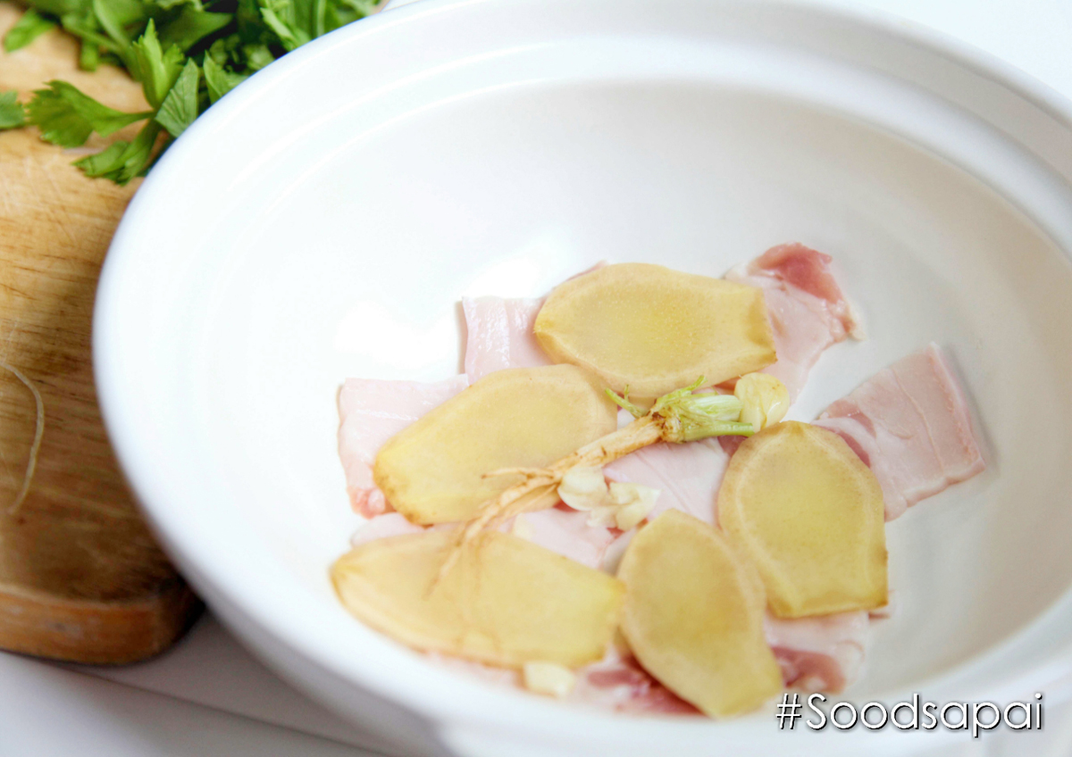 2. นำหมูสามชั้นหั่นชิ้นวางไว้ด้านล่างสุดให้ทั่วภาชนะ (ถ้าไม่มีหม้อดินอบ ใช้กะทะหรือหม้อก็ได้ค่ะ) ต่อจากหมูสามชั้นก็เป็นขิง พริกไทยตำโรยให้ทั่วๆ ตามด้วยรากผักชีทุบ 1ราก กระเทียมทุบ
