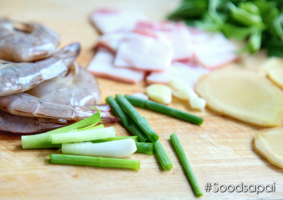 ขณะที่กำลังทาน พี่หนุ่ยเลยสัญญาว่าจะลองทำเมนูนี้ให้ทาน วันนี้โอกาสเหมาะล่ะ ของครบ ขาดก็แต่พริกหอม แต่ไม่เป็นไร ทำได้ๆ ขึ้นฉ่าย ต้นหอม เครื่องปรุงอื่นพร้อม..