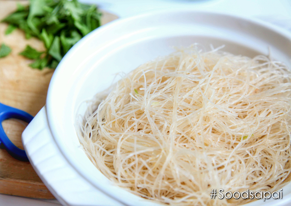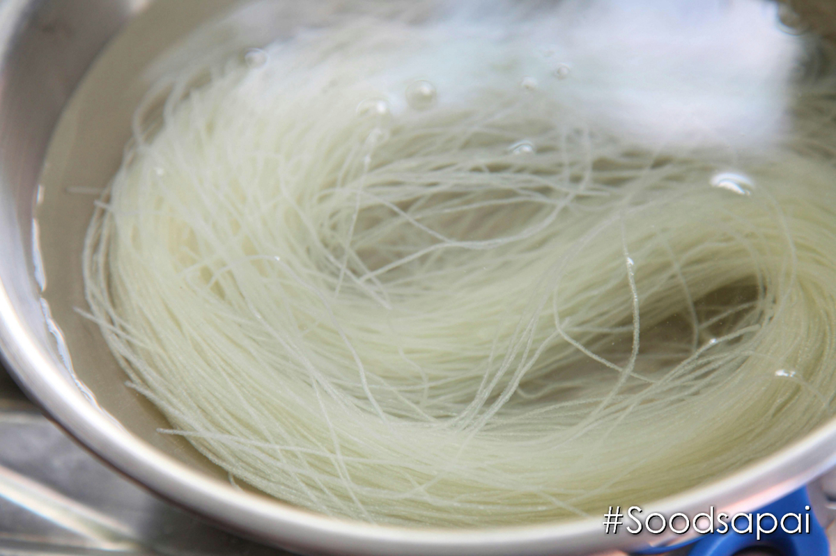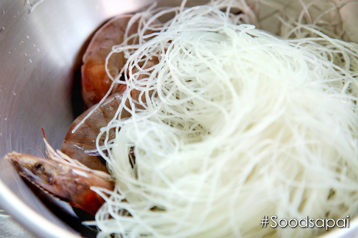 1. นำวุ้นเส้นแช่น้ำ พออิ่มน้ำ นำมาพักสะเด็ดน้ำ พักไว้