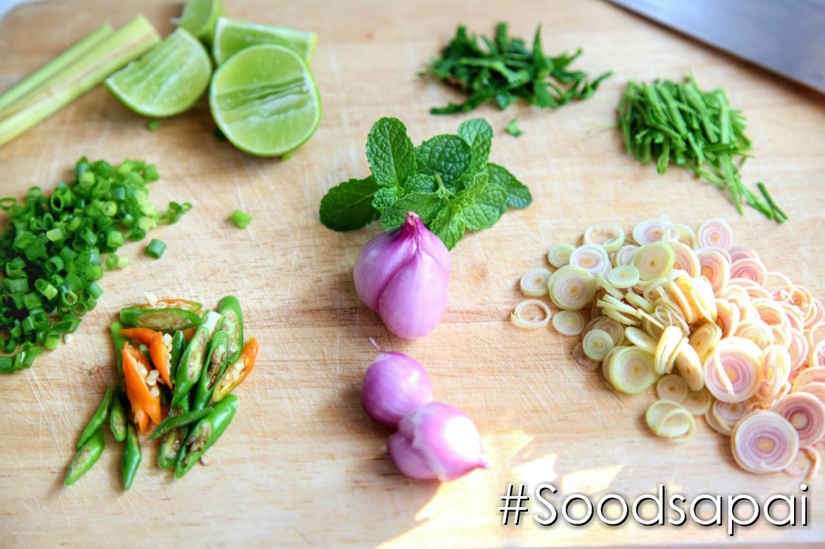 1.ซอยตะไคร้ ใบมะกรูด ผักชีฝรั่ง หอมแดง พักไว้