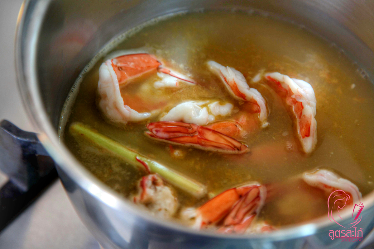 2.ตั้งน้ำพอเดือดทุบตะไคร้ใส่ลงไปแล้วแล้วลวกกุ้งพอสุกเล็กน้อย พักไว้