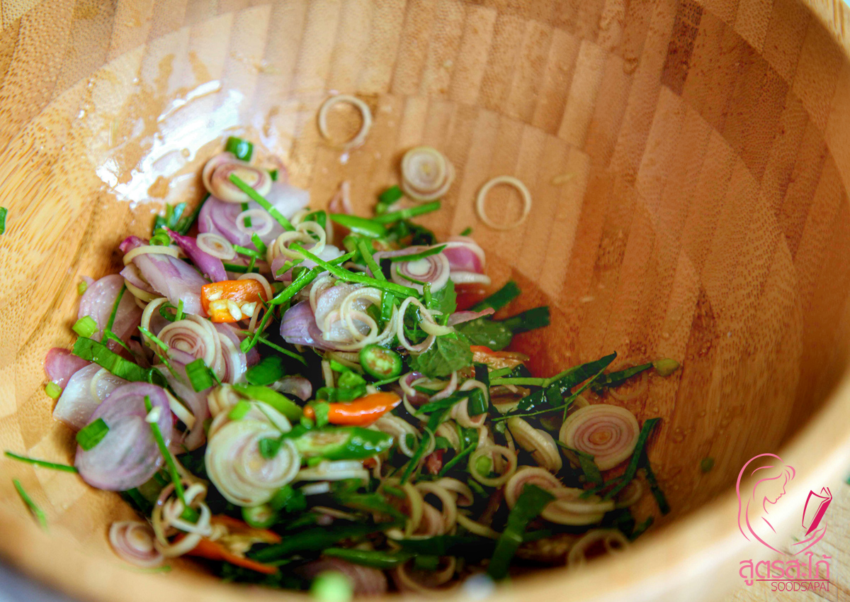 3. ทำน้ำยำ ใส่น้ำปลา น้ำตาล ซีอิ๊วขาว บีบมะนาว คนให้น้ำตาลละลาย ใส่พริกและผักที่ซอย
