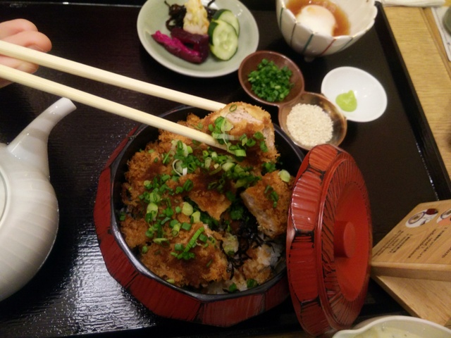 2. แบ่งข้าวและชิ้นหมูใส่ชาม เติมเครื่องเคียง เพื่อเพิ่มรสชาติ ต้นหอม งาขาว และวาซาบิ