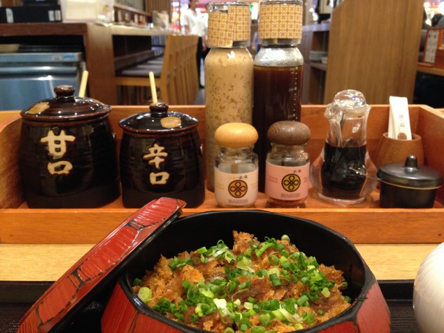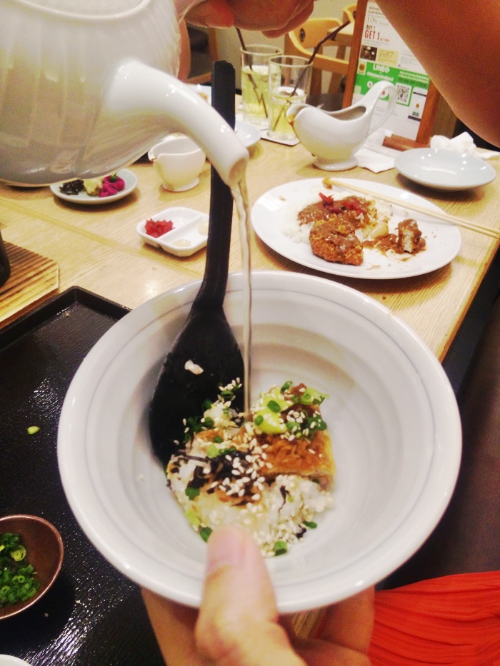 3. แบ่งข้าวและชิ้นหมูใส่ชาม เติมเครื่องเคียง เพื่อเพิ่มรสชาติ ต้นหอม งาขาว และวาซาบิ และเติมนำ้ซุปสูตรพิเศษรสชาติกลมกล่อม