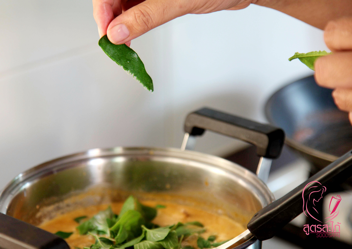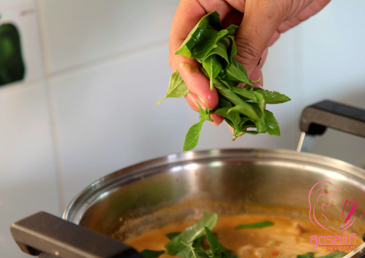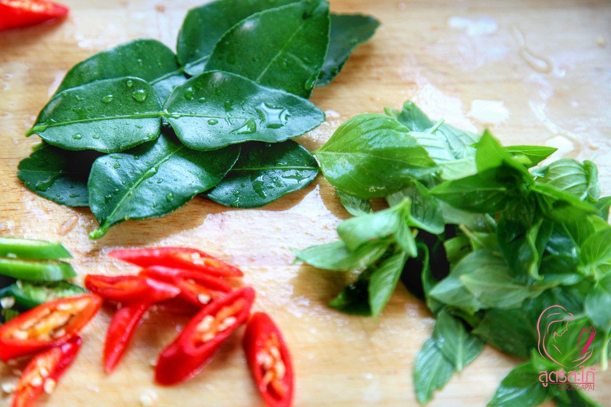 4. ใส่พริกชี้ฟ้าแดง เขียวหั่นเฉียง ใบมะกรูด และใบโหระพา ปิดไฟ ตักเสริฟ โรยด้วยใบมะกรูดซอย