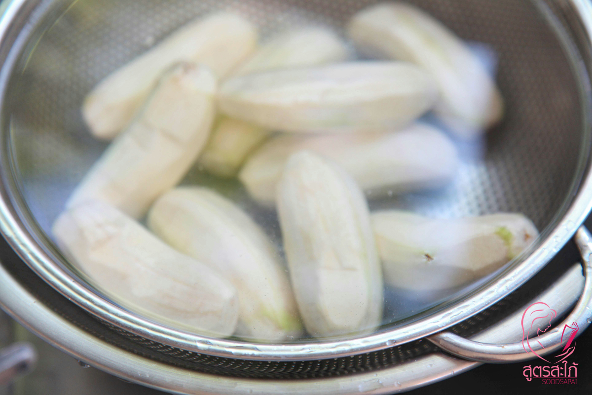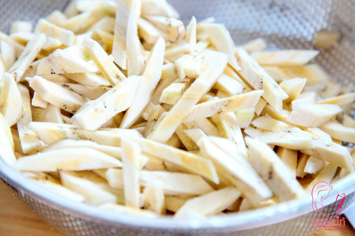 1. ปลอกกล้วยดิบ ปลอกแล้วต้องแช่น้ำเลยนะคะ กล้วยจะได้ไม่ดำ ระวังยางกล้วยเลอะเสื้อผ้านะคะ...ถ้าเหนียวๆที่มือใช้น้ำมันพืชถูๆออกค่ะ นำมาหั่นเฉียงๆ พักไว้