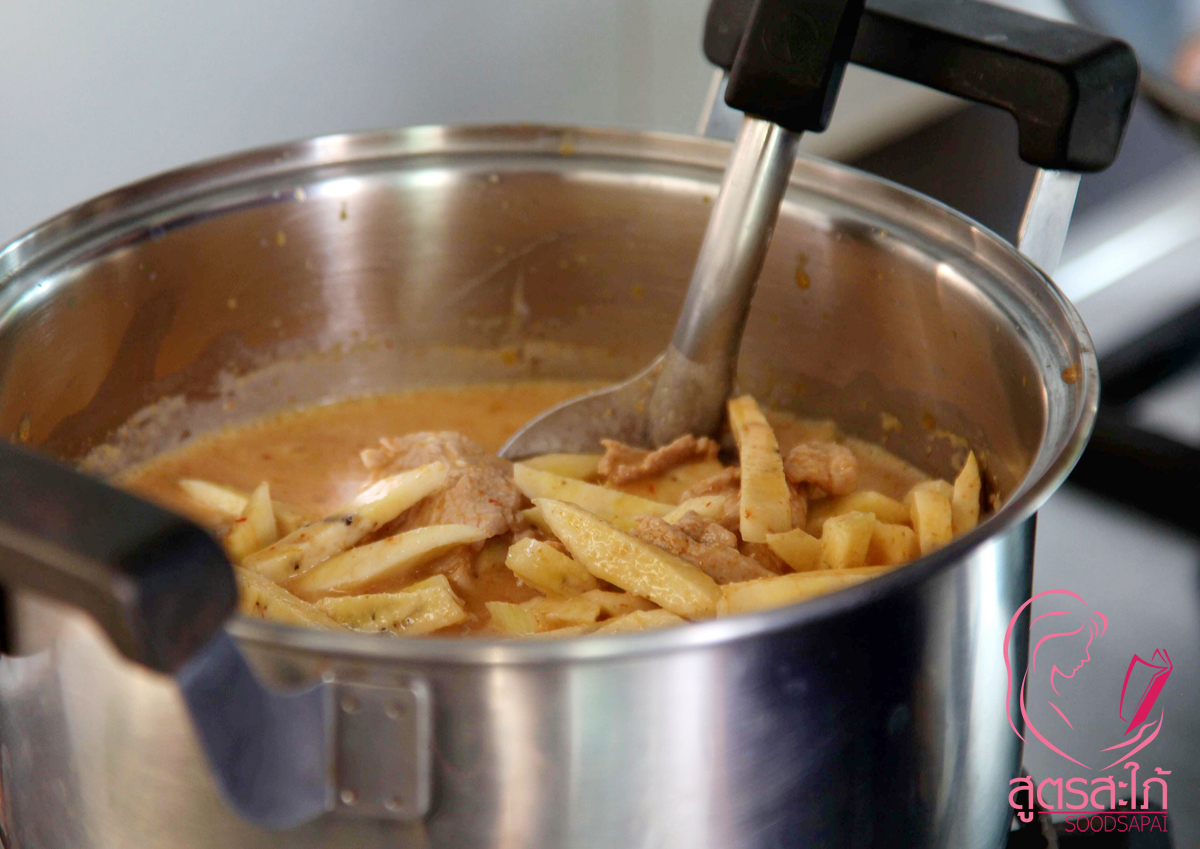 3. นำหัวกะทิตั้งไฟในกะทะไฟกลาง พอเดือดใส่พริกแกงเผ็ด ผัดให้เข้ากันพอหอม ใส่หมูหั่นชิ้นผัดให้หอมเนื้อหมูเริ่มสุก ตักไปใส่หม้อที่ตั้งหัวกะทิไว้ คนให้เข้ากัน ปรุงรสด้วยนำปลา น้ำตาล ชิมรส ใส่กล้วยดิบที่หั่นไว้ลงไป พอเดือด ชิมรสและปรับรสตามชอบค่ะ