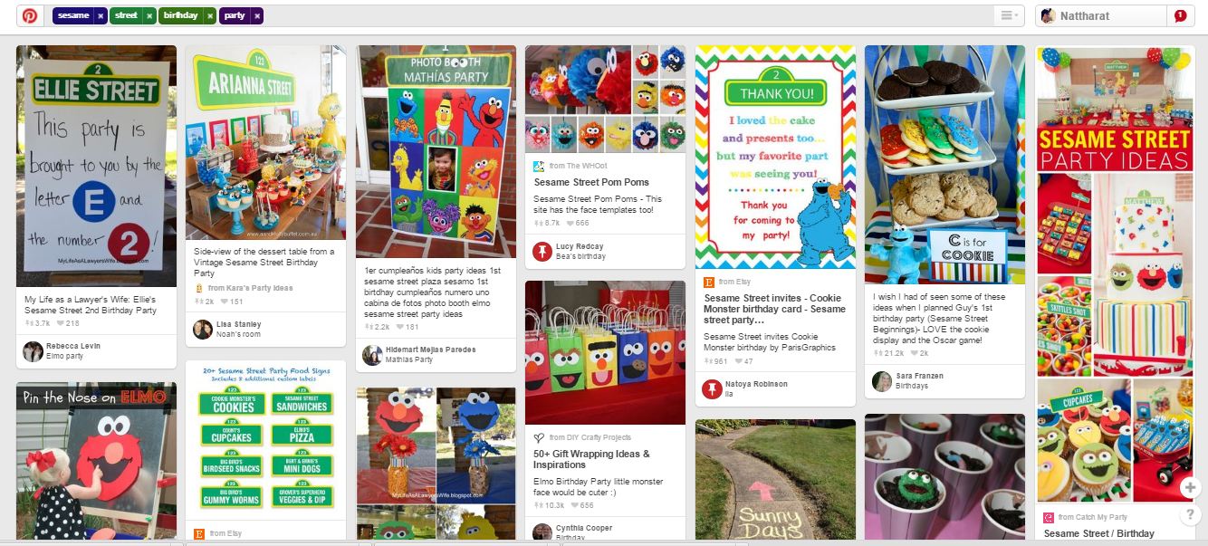 สิ่งแรกที่ทำคือ หาไอเดียคะ ว่างานวันเกิดแบบ Sesame Street ฝรั่งเค้าทำอะไรกันบ้าง เลยเลือกหาไอเดียที่ "Pinterest" มีรูปเยอะเลยคะ แค่ใส่ Key word "Sesame Street | birthday | party" เท่านี้ก็ขึ้นภาพมาเต็มเลย