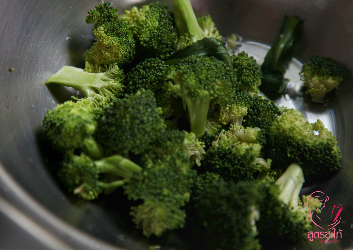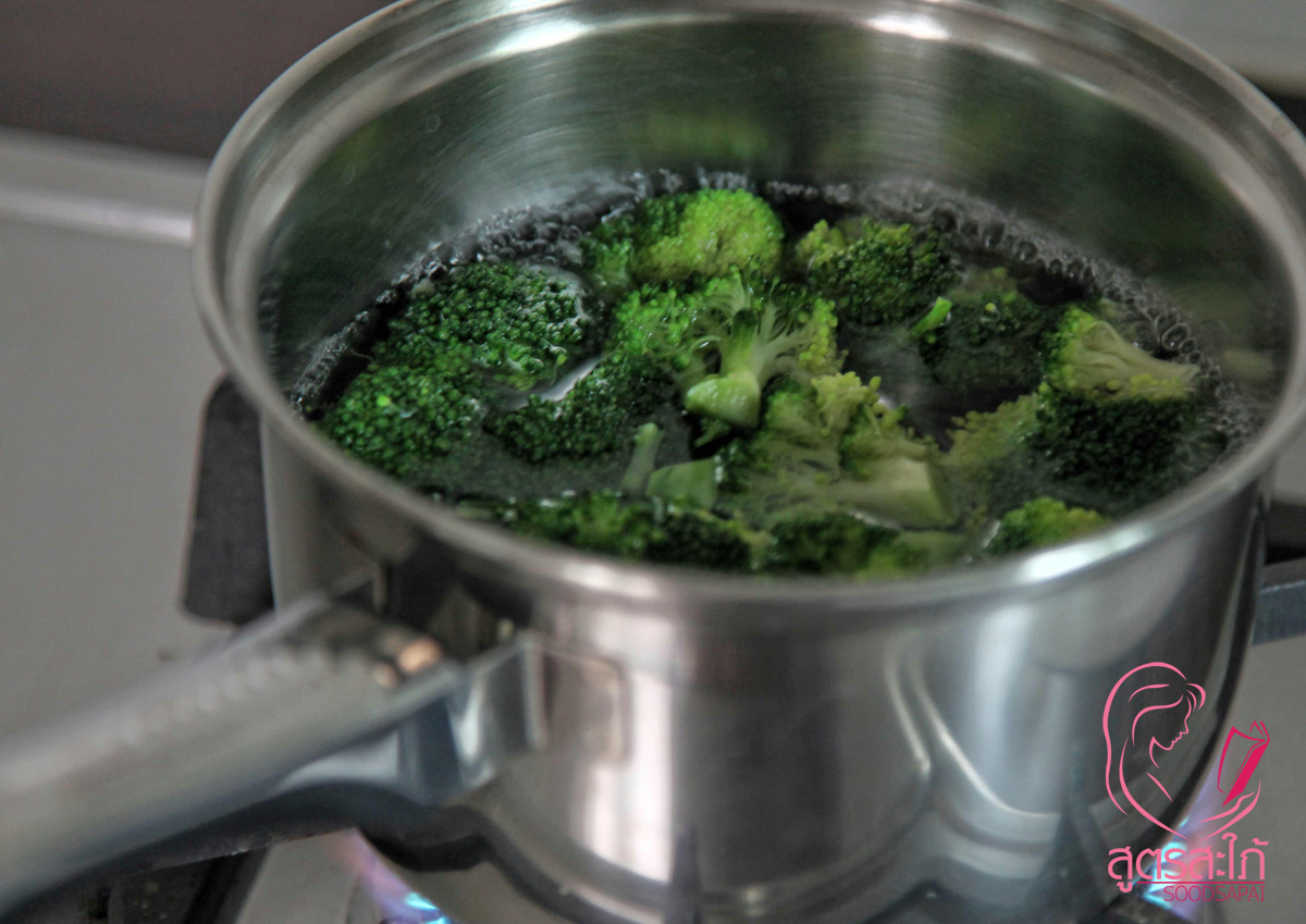 1. ตั้งน้ำสำหรับต้มผัก เติมเกลือลงไปเล็กน้อย พอเดือดนำบล็อคโคลี่ลงต้ม พอเดือดอีกรอบ นำขึ้นมาแช่น้ำเย็น เพื่อหยุดการสุกของผักค่ะ แล้วนำขึ้นมาสะเด็ดน้ำ พักไว้