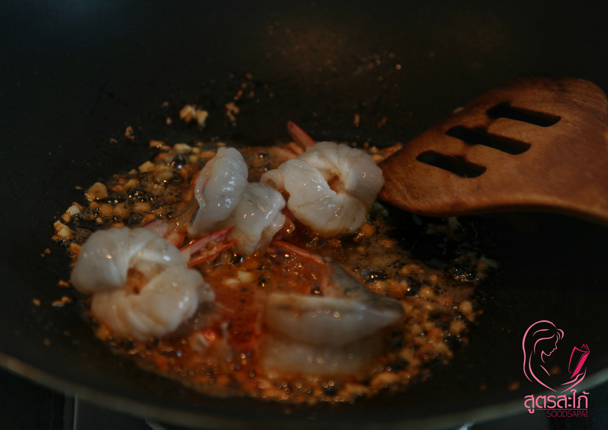 2. ตั้งกะทะใส่น้ำมันพอร้อน ใส่กระเทียมสับลงเจียวพอหอมใส่กุ้งสดลงผัด
