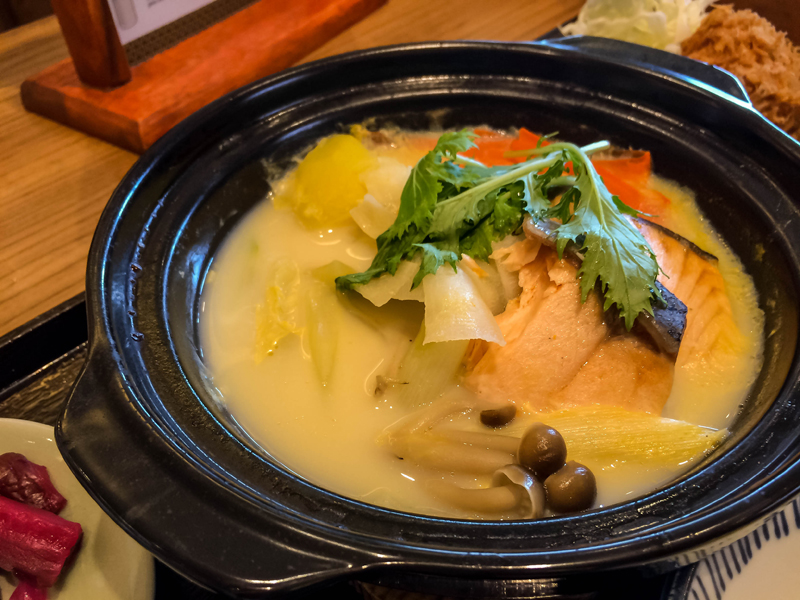 Salmon Tonyu Nabe อัดแน่นด้วยเนื้อปลาแซลมอน ชิ้นใหญ่ ผักหลากหลายชนิด ไม่ว่าจะเป็น ต้นหอมญี่ปุ่น แครอท หัวไชเท้าสไลด์ เห็ด และผักมิซูนา ที่ล้วน Healthy สุดๆ