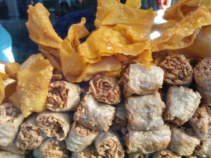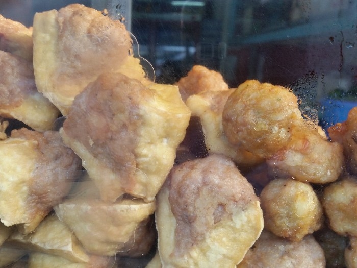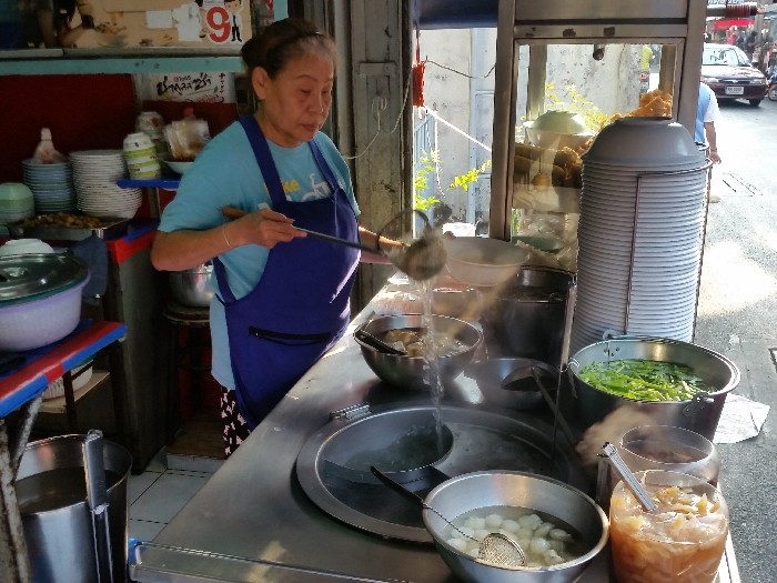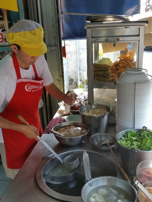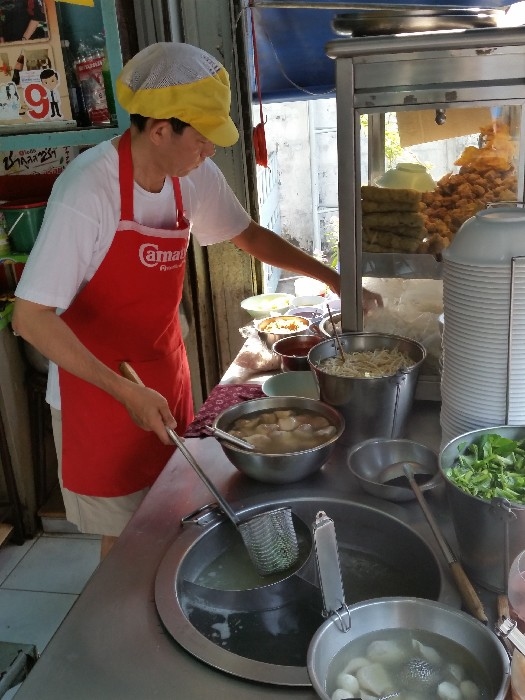 ในตู้ก๋วยเตี๋ยวจะมีของอร่อยใส่ไว้ ทั้งลูกชิ้นแคะ ลุกชิ้นกุ้ง และเผือกทอดกรอบ บางวันไปก็เจอเฮียคนนี้ยืนบรรเลงหน้าเตา บางวันก็เจอพี่ผู้หญิงคนนี้ แต่ส่วนมากจะเจอคนนี้นะ ด้านหลังเค้าวางถาดใส่ของอร่อย หมัดเด็ดไว้ นั่นคือ เผือกทอด ครับ ทำได้อร่อยมาก กรอบกรุบ เคี้ยวทีไม่มีเกรงใจฟันปลอม ฟันครอบกันเลย