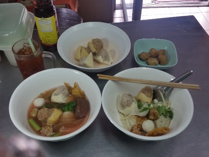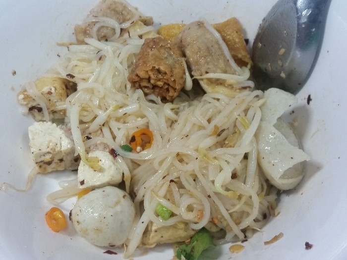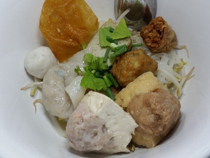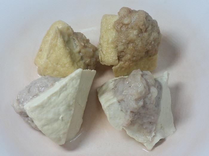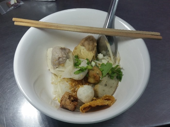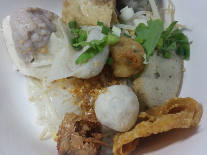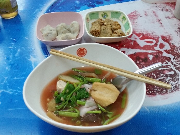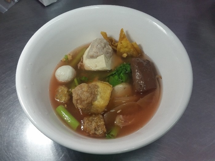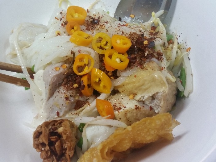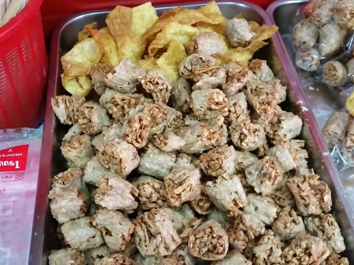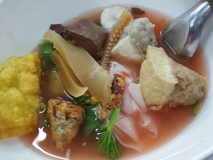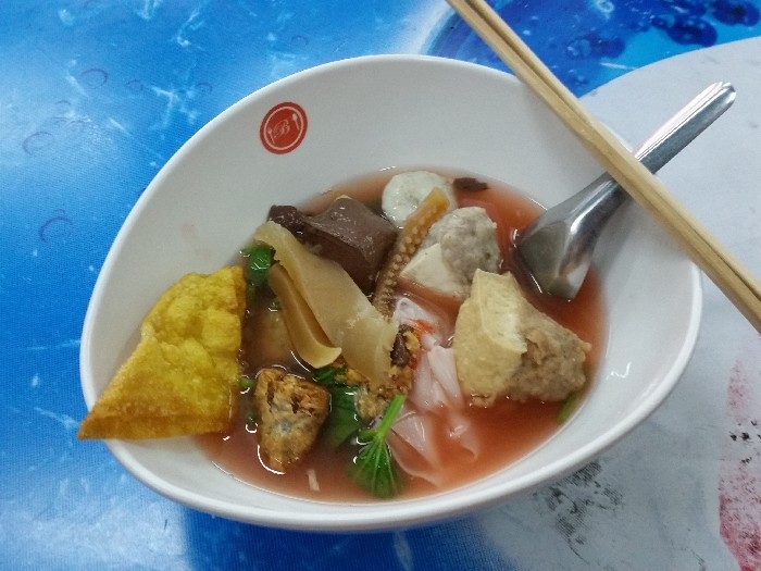 มาร้านนี้ ต้องสั่งเผือกทอดมากินเล่นก่อนเลย เป็นของต้องห้ามพลาดจริง ๆ ครับ ถ้วยละ 40 บาท เผือกหั่นเส้น ๆ เคล้าแป้งหมี่บาง ๆ แล้วห่อด้วยฟองเต้าหู้ นึ่งให้สุก แล้วนำมาหั่นพอคำ ทอดให้เหลืองกรอบ กินเล่น กินกับก๋วยเตี๋ยว เข้ากันดีเหลือเกินครับ ลูกชิ้นกุ้ง เป็นของดีเด่นอีกอย่างที่ไปทีไร ต้องสั่งมากินเล่นครับ ถ้วยละ 40 บาทเช่นกัน เนื้อใน เป็นกุ้งบดผสมแห้วบดมาด้วย ปรุงรสมานิดหน่อย ยิ่งมาเช้า ๆ ทอดมาใหม่ ๆ นะคุณเอ๋ย อย่าให้เหลา เกี๊ยวปลา ร้านนายฮั้วทำเกี๊ยวปลาได้ดีงาม อร่อยใช้การได้ครับ ถ้วยนี้ 40 บาทครับ ลูกชิ้นแคะ ถ้วยละ 40 บาท มีมา 4 ลูก ทั้งสองแบบครับ เปลือกเหนียวนิด ให้คิดถึงเต้าหู้ทอดสีน้ำตาล ถ้าชอบนิ่ม ๆ ต้องแบบเต้าหู้นึ่งครับ ตัวหมูบด ที่เค้าผสมเนื้อปลา กุ้งแห้งป่น ตามตำรับจีนแคะนั้น อร่อยครับ