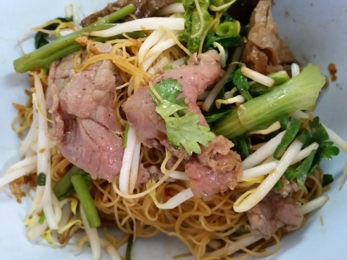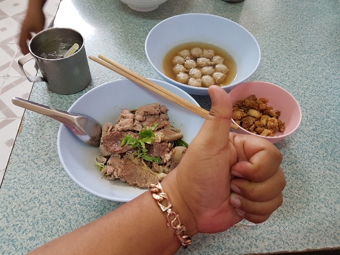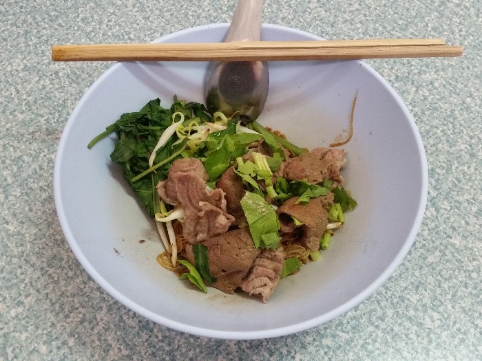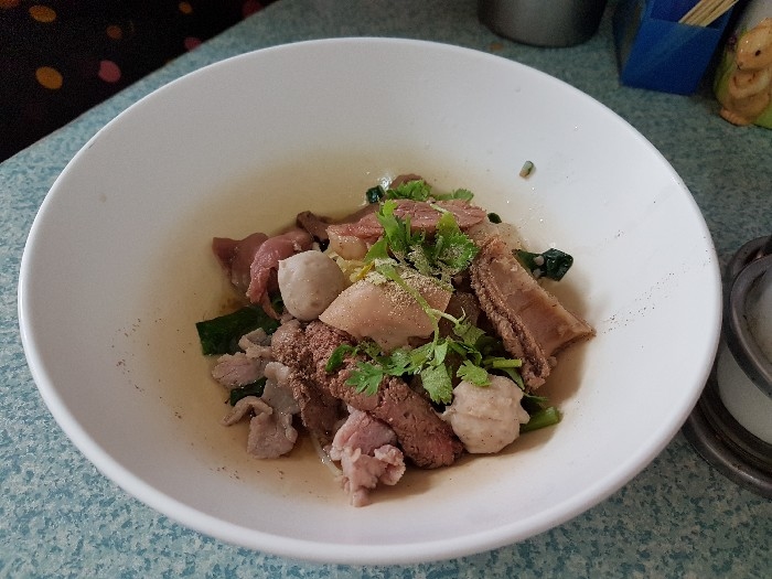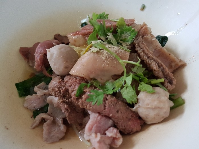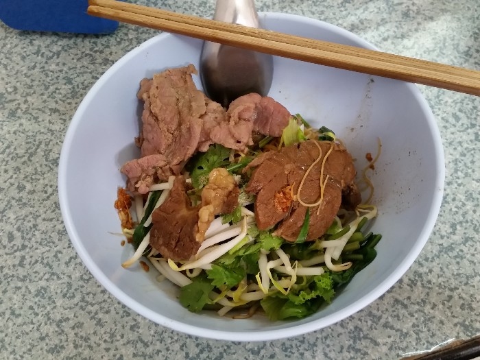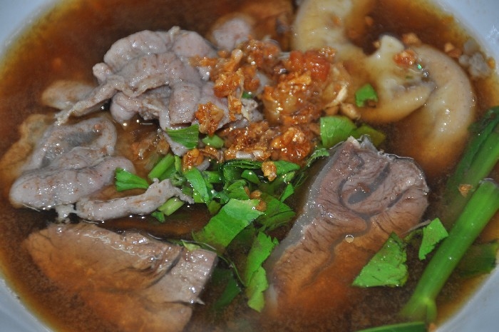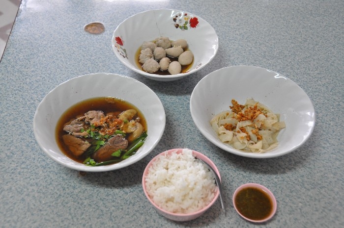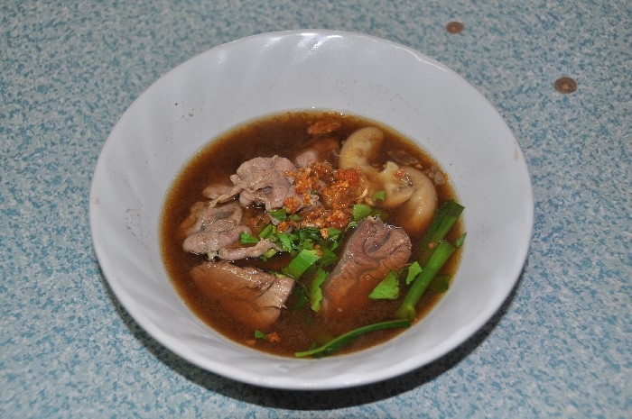 สั่งประเดิมตามที่ชอบด้วยเส้นหมี่แห้ง สด เปื่อย บ้าง , สด ตับ บ้าง ตามโอกาส เพราะแวะไปหลายครั้งครับ ( 40 บาท ) เกาเหลากันบ้าง ตามโอกาส ก็ต้องมีข้าวสวยและน้ำจิ้ม ซึ่งปรุงเองตามสูตร ก็สูตรใครนะครับ ค่อย ๆ ทยอยมา ให้เข้าชุดกันไป เดี่ยว ๆ ก็มี กับราคา 40 บาท เพราะไม่ค่อยสั่งแบบพิเศษครับ ชายกางชอบสั่งแยกกันสนุก ๆ ลูกชิ้นเนื้อลวก ลูกชิ้นเอ็นเนื้อลวก ชามนี้แหละครับ ที่อยากแนะนำให้ลอง เพราะตอนนี้ ชายกางในส่วนตัวแล้ว ยกให้ร้านลูกชิ้นบางโพ ทำลูกชิ้นเอ็น อร่อยที่สุดแล้วครับ เนื้อสดลวก ผ้าขี้ริ้วลวก