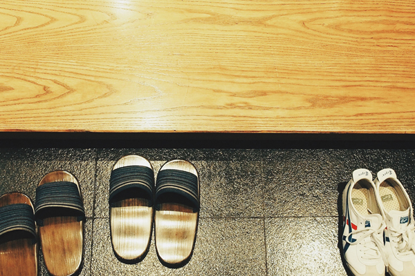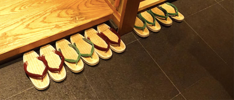 หากเป็นบริเวณปูเสื่อตะตะมิ ก็ควรต้องถอดรองเท้าก่อนขึ้นไปนั่งในบริเวณ แม้จะเป็นรองเท้าเเตะก็ตาม ให้ถอดรองเท้าไว้บริเวณที่จัดเตรียม