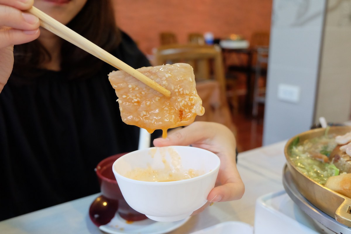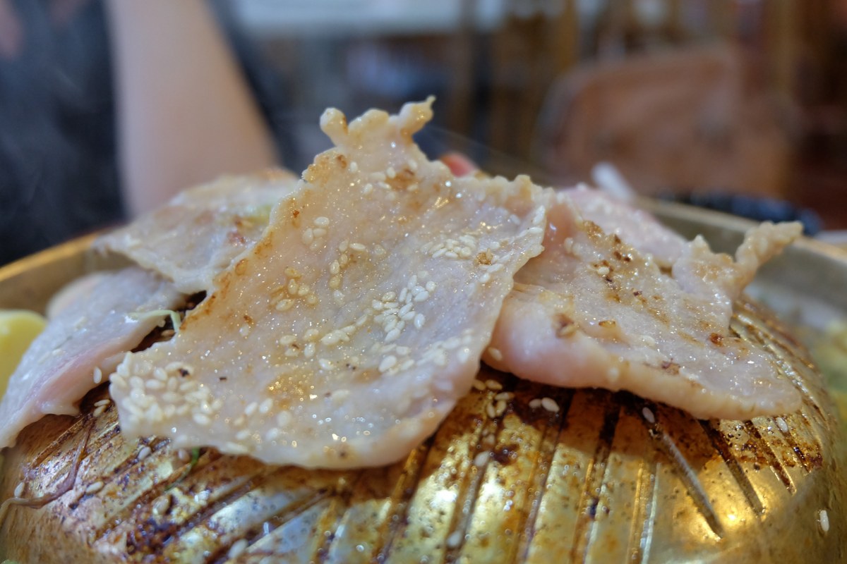 หมูนุ่ม ๆ จิ้มกับน้ำจิ้มชุ่ม ๆ อ้ามมมมม!!! เราติดใจหมูสไลด์ของร้านนี้อ่า คือนุ่มมาก แล้วจุดเด่นอีกอย่างคือ เค้าโรยงาด้วย ทำให้พอเวลาย่างแล้วหอม แต่ๆๆ คำเตือน อย่าเผลอคว่ำหน้าหมูที่เป็นด้านงาลงไปนะ 555 เพราะเราทำไปแล้ว เดี๋ยวงาจะติดกระทะเอา