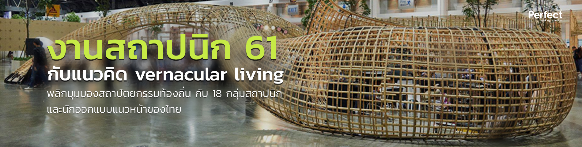 ปัจจุบันสถาปัตยกรรมในท้องถิ่นต่าง ๆ กำลังถูกท้าทายด้วยปรากฏการณ์โลกาภิวัตน์ การเปลี่ยนแปลงของสภาพภูมิอากาศ และการเปลี่ยนแปลงจากสังคมชนบทไปสู่สังคมเมือง ซึ่งงานสถาปนิก’ 61 ไม่ธรรมดา นับเป็นครั้งแรกของงานสถาปนิกกับการออกแบบพาวิเลียน สำหรับนิทรรศการหลักของงานโดยสถาปนิกและนักออกแบบกว่า 18 กลุ่ม เปิดโอกาสให้คนทำงานสร้างสรรค์หลากหลายเจเนอเรชัน ร่วมกันนำเสนอ Vernacular Living ในมุมมองของตนเอง