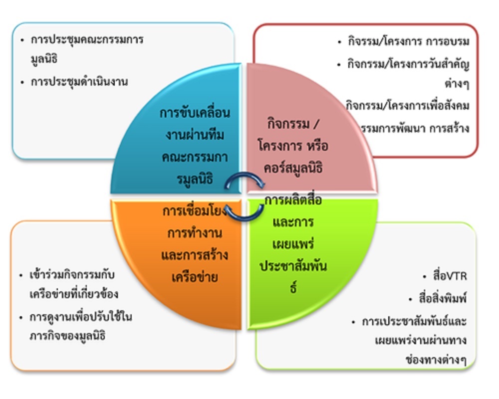 4) การผลิตสื่อและการเผยแพร่ประชาสัมพันธ์ ประกอบด้วยการผลิตสื่อต่างๆที่เกี่ยวข้อง และการเผยแพร่ ประชาสัมพันธ์ผลการดำเนินงานของมูลนิธิผ่านช่องทางต่างๆ (ดูรายละเอียดคลิ๊ก)