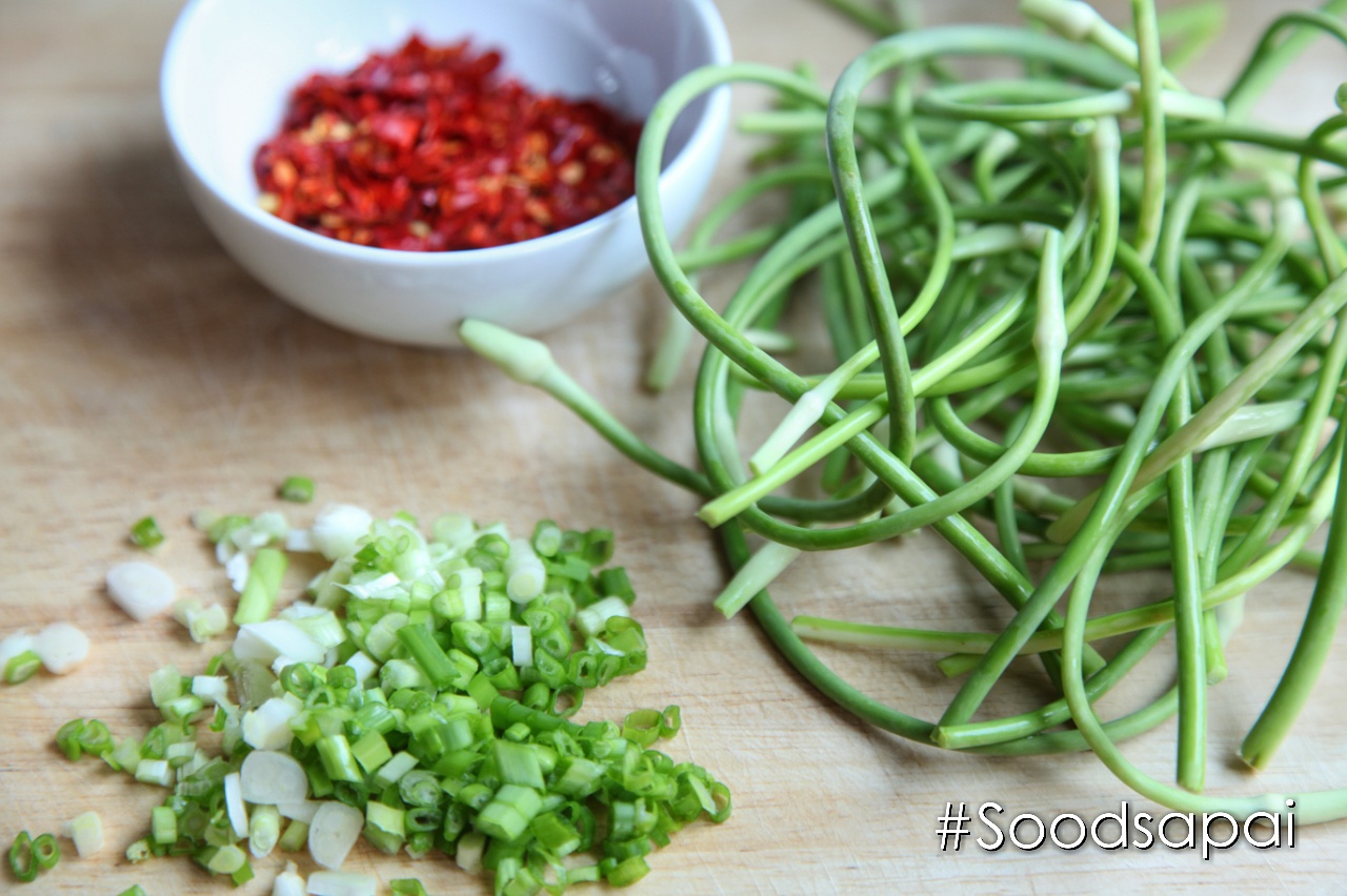 เมื่อเช้าลงมาในครัว เห็นอะไรเหลืองๆในหม้อ คล้ายๆสปาเก็ตตี้ 555 ... ถามคำว่า "ในหม้อนั่น อะไรอ่ะ???...คำบอก "ก้านกระเทียมต้มค่ะพี่"...ว่าแล้วเราก็ทำกับข้าวของเราต่อ... พอพี่หนุ่ยทำเสร็จ ได้ยินคำทำอะไรก๊อกๆแก๊กๆในครัว ด้วยความอยากรู้ ไปแอบดู ...