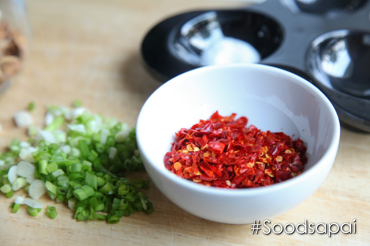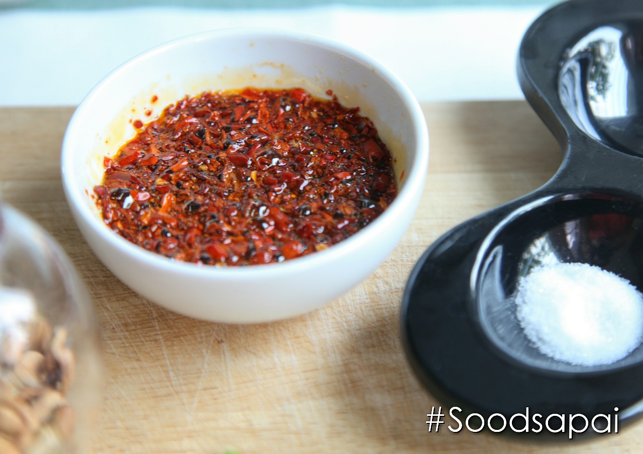 2.ตั้งกะทะใส่น้ำมันพอร้อน ดับไฟ ตักน้ำมันใส่ถ้วยที่เตรียมพริกป่นใส่ไว้