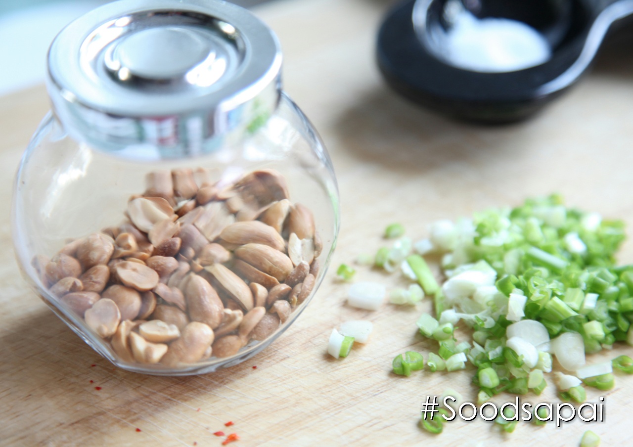 3.จากนั้นก็นำก้านกระเทียมใส่กะทะ แล้วนำน้ำมันพริกค่อยราดบนก้านกะเทียม ใส่ถั่วลิสงคั่วตำ ใส่เกลือ(สำหรับคนที่ควบคุมความดันเลือดไม่ใส่เกลือหรือใส่แต่น้อยนะคะ) และต้นหอมซอย ... ชิมรสดูตามใจชอบ... โอววววว เริ่ดๆๆ...