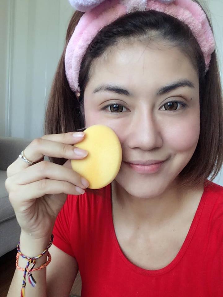 จากนั้นเอาฟองน้ำจุ่มน้ำให้หมาดๆ แล้วกดไปที่แป้ง เอามาทาทั่วหน้าอีกทีค่ะ เพื่อเซ็ตแป้งและรองพื้นเพื่อเพิ่มความแน่น และให้รองพื้นติดทนทานมากยิ่งขึ้น