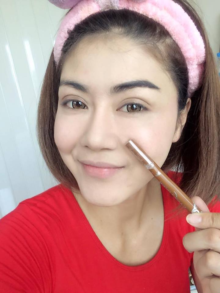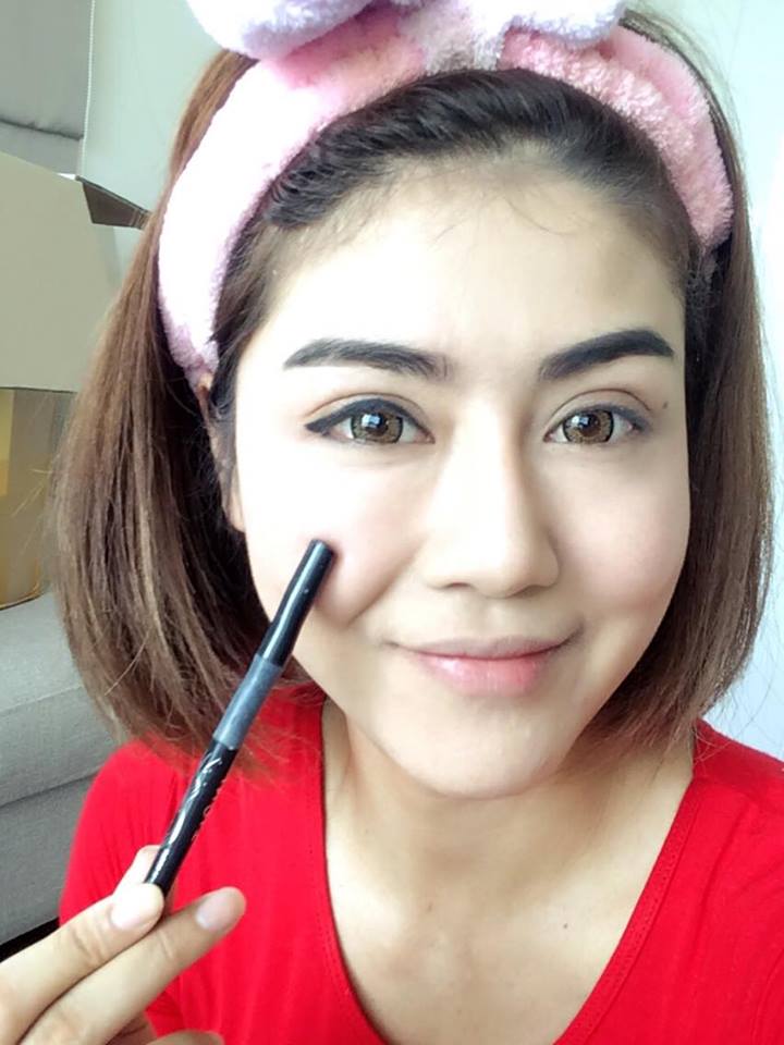 อุ๊เลือกใช้แบบเมจิก เพราะจะทำให้เวลาโดนน้ำแล้วสียังคงแน่นและไม่หลุดแบบเขียนด้วยดินสอ หรือฝุ่นค่ะ เทคนิคคือ เขียนให้เข้มๆ ได้เลยค่ะ ช่วงหัวคิ้ว ก็ใช้แปรงเบลนๆ ให้อ่อนกว่าหางคิ้วหน่อยค่ะ