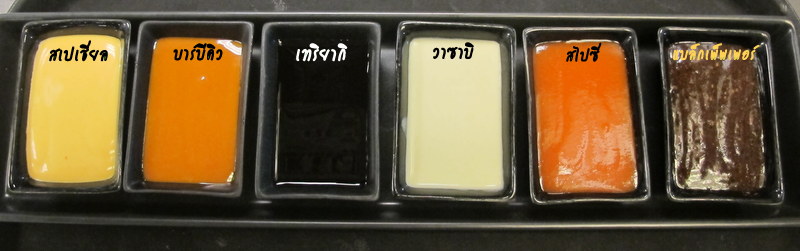 Spicy Sauce (เผ็ดเข็มข้น สไตล์อเมริกัน สูตรจากฮาวาย) : สำหรับคนชอบกินเผ็ด ทางร้านบอกว่า เผ็ดกว่าเมืองนอกนะคะ จะได้ถูกปากคนไทย Wasabi Sauce (รสชาติของวาซาบิและจะออกมันๆ) : อันนี้เมย์ชอบส่วนตัวเลย เวลาจิ้มมันฝรั่งทอดแล้วชอบมาก กินจนเกลี้ยงเลยค่ะ Black Pepper Sauce (รสชาติเค็มๆนิดหน่อย) : นี่หอมพริกไทย รสจะเข้มหน่อยไม่เหมือนซอสพริกไทยในอาหารฝรั่งทั่วไป อันนั้นจะจางลงอีกนิดนึง