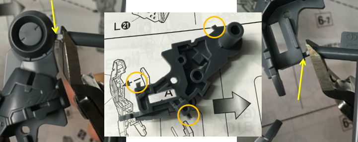 1) ตัดชิ้นส่วนออกจากแผงด้วยคีมตัด โดยเว้นระยะให้เหลือ ส่วนเกิน หรือ ติ่ง ของแผงไว้นิดนึงตำรา Hobby Japan จะบอกให้เอาสีมาแต้มติ่งส่วนเกินไว้ จะได้ไม่ตัดผิดไปตัดส่วนติ่งที่เป็นชิ้นงานจริง