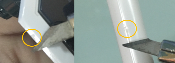 2) ตัดส่วนเกินออกจากชิ้นงาน โดยแนบคีมตัดด้านเรียบชิดชิ้นส่วน กดแชะเดียวขาด อย่ากดหน่วงแรง โดยตรงรอยตัดจะเหลือรอยขาวๆขรุขระๆอยู่ ซึ่งถ้าคีมตัดไม่คมพออาจจะเหลือรอยขาวชัดมากกว่าปกติ
