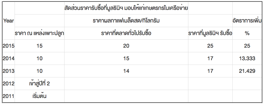 โดยมูลนิธิฯ มีการรับซื้อเมล็ดกาแฟจากเกษตรในเครือข่ายในราคาที่เป็นธรรม (Fair Trade) เพื่อสนับสนุนการศึกษานอกระบบให้แก่ลูกหลานของสมาชิก ดังตารางด้านล่าง