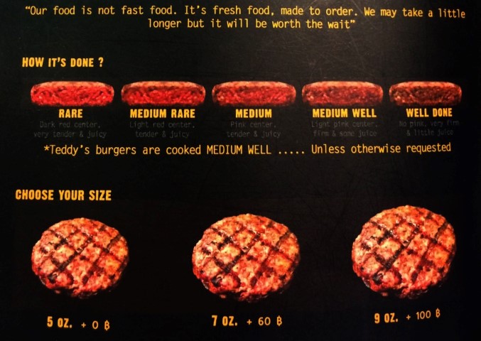 สำหรับการสั่งเบอร์เกอร์ทาน เราขอแนะนำนิดนึงก่อนว่า เราสามารถเลือกระดับความสุกของชิ้นเนื้อได้ ซึ่งโดยปกติแล้ว ทางร้านจะทำมาในระดับ Medium Well แต่เราสามารถเปลี่ยนเป็น Rare, Medium Rare,  Medium, Medium Well และ  Well Done
