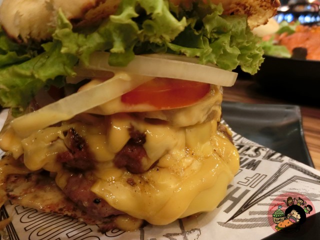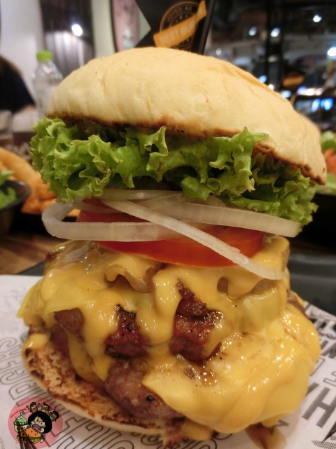 heart-  Monster Double Burger :  ซึ่งเป็นเมนูที่จัดเต็มโดยเบิ้ลเนื้อ (หมู / ไก่ ) ขนาด 5 oz. เป็น 2 ชิ้น  แทรกด้วยผักกาดหอม , หอมหัวใหญ่, มะเขือเทศ, แตงกวาดอง และที่ขาดไม่ได้คือ ซอสสเปเชี่ยล แต่เราสั่งเพิ่มเบคอน, เชดด้าชีส และสับปะรดกริลล์