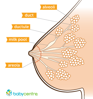 นมแม่นั้นผลิตโดยต่อมน้ำนมที่เรียกว่า Mammary Glands ซึ่งประกอบไปด้วย แอลวีโอไล (Alveoli) หน้าตาเหมือนพวงองุ่นคะ เป็นที่ผลิตน้ำนม โดยรอบๆมีกล้ามเนื่อเล็กๆคอยบีบส่งน้ำนมไปตามท่อเล็กๆเรียกว่า Ductules เพื่อส่งต่ออกไปตามท่อน้ำนมใหญ่ (Milk ducts)