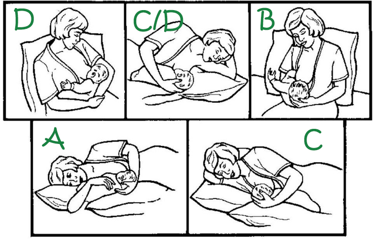 - ก้อนตำแหน่ง D ใช้ท่า Cradle hold ท่ามาตรฐาน คางชี้ไปทางกลางอกของคุณแม่