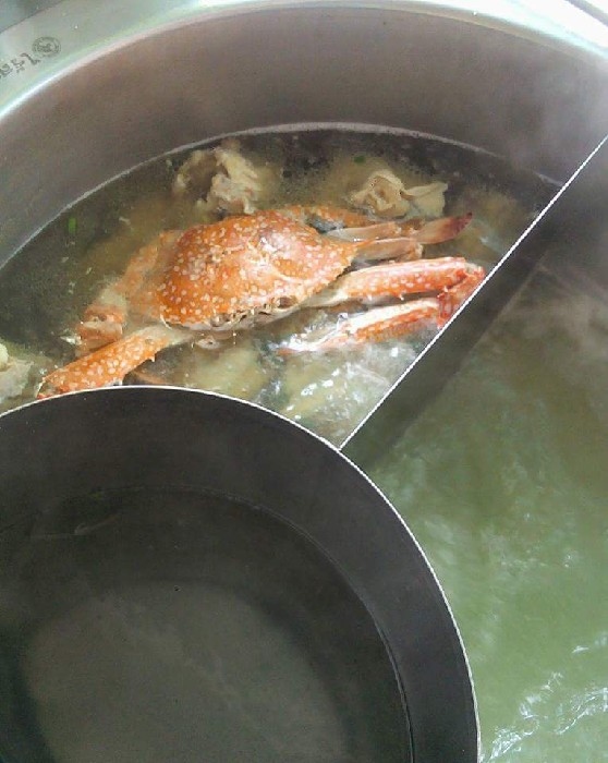 น้ำซุบเดือดพล่านตลอด แอบชะโงกมองลงไป มีปูม้าลอยอยู่ในหม้อด้วย สอบถามได้ความว่า อากงบอกไว้ว่า น้ำซุบบะหมี่ปู ต้องต้มปูเอารสชาติ เอากลิ่นของปู ไปผสมกับความหวานนุ่ม ๆ ของโครงไก่