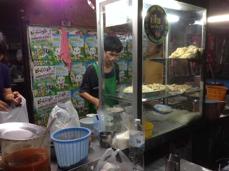 หน้าร้านมีรถเข็นที่บรรจุของอร่อยไว้เต็ม