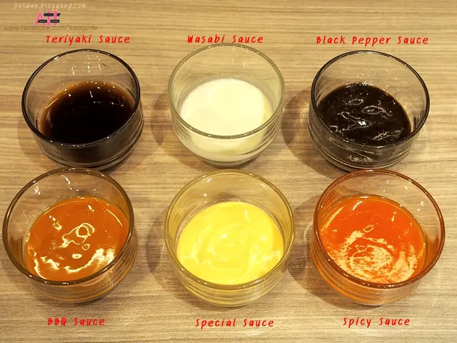 ก่อนจะไปปิดท้ายด้วยอะไรหวานๆ (ที่ไม่ใช่ของหวาน เพราะวันนั้นของหวานหมดง่ะ) ให้ดูซอสทั้งหกชนิดที่มีให้เลือกก่อนค่ะ หน้าตาก็ประมาณนี้นะฮับบบ