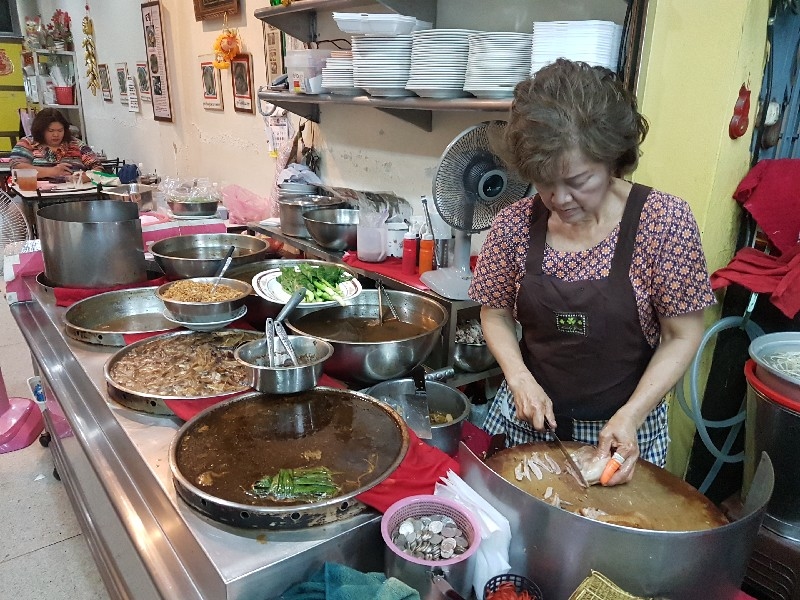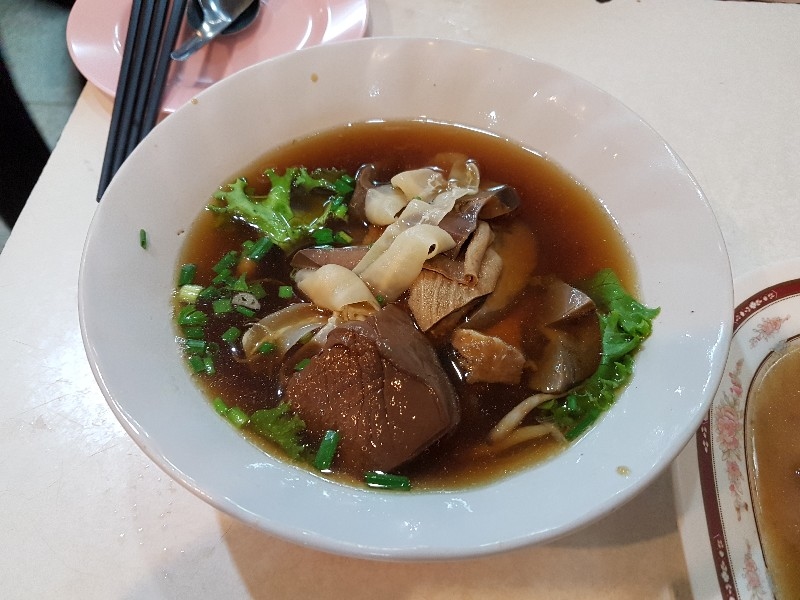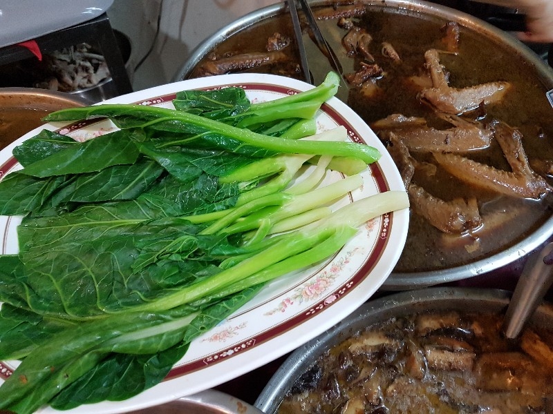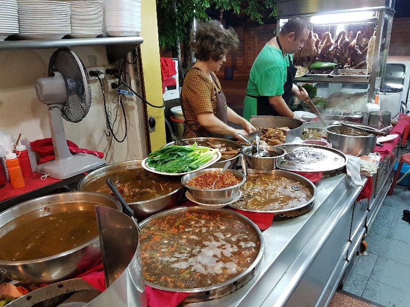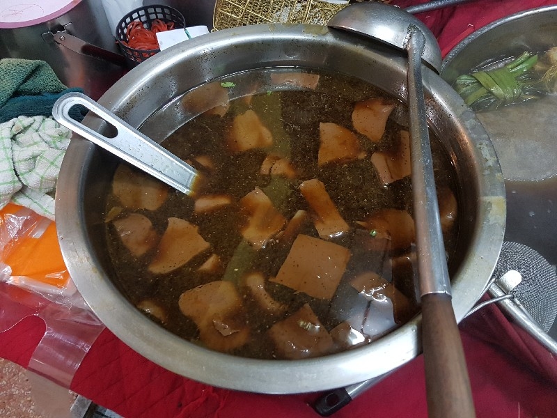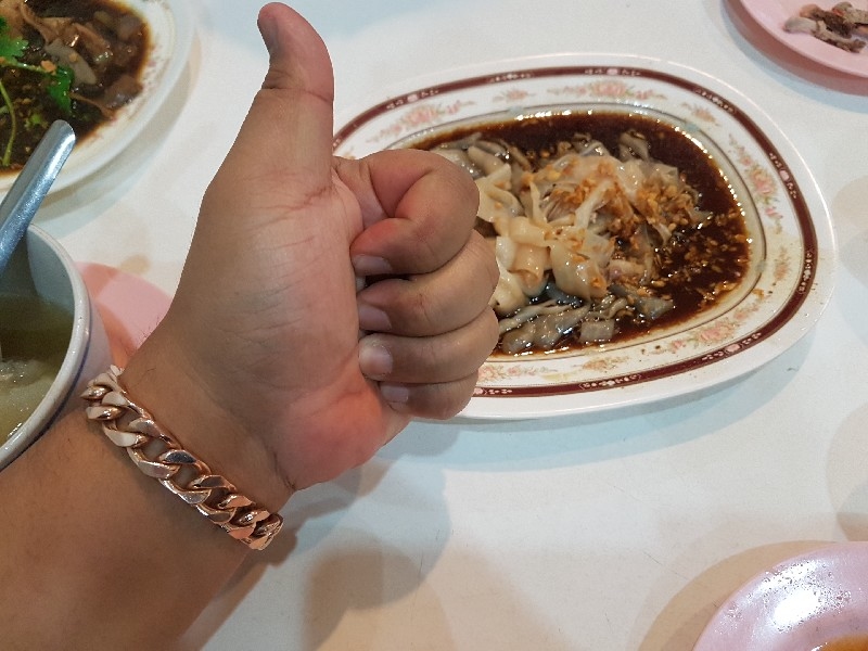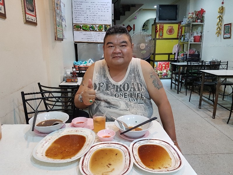 หนุ่มคนที่ยืนทำนั่นนี่ คล่องตัว ชื่อว่า “ อ้น ” ครับ โดยมีคุณแม่ ยืนช่วยและคอยกำกับอีกทีครับ แถบนี้ก็จะตั้งของอร่อย ๆ ไว้ยั่วตามากมาย กาละมังใส่เลือดเป็ดนี่ยั่วตามากครับ กาละมังถัดมา เป็นพระเอกในใจของชายกางเลยครับ เม่งซุ่ง ( หน่อไม้จีน ) ต้มเค็มใส่เห็ดหอม แนะนำว่าห้ามพลาดครับ ข้อไก่ตุ๋น เปื่อยมาก ตีนเป็ดพะโล้เปื่อย ๆ หอม ๆ ปีกเป็ด ที่สาวกขาเบิร์น ต้องชอบ เพราะดูด ๆ แทะ ๆ สุดจะเพลิน คะน้าลวก ที่นี่ ใส่ใจในการเตรียมคะน้าดีมากครับ ปอก ลอกเปลือก ลอกผิวที่แข็งออกจนเกลี้ยง ลวกมาสุกกรอบ เขียวสวยงามตลอดจนถึงจานท่านครับ ไส้แก้วพวงโต จะแขวนอยู่ที่ตู้โชว์ ใกล้มือหนุ่มอ้นครับ หม้อน้ำจิ้มใบโต ที่ขอบอกว่า อร่อยมาก ๆ รสจัดจ้านเฉียบขาดมากครับ ตรงหน้าเตานี้ เป็นเสมือนกองบัญชาการหลักครับ สองคนคุณแม่กับคุณลูกชาย ทำกันมิได้หยุดครับ ป้ายบอกราคาค่าอร่อยในแต่ละแบบที่ท่านชอบครับ สารพัดสำนักที่แวะเวียนมาร้านนี้ครับ น้ำชาจีนใส่น้ำแข็ง เสริฟมาเป็นเหยือกครับ สะใจดีแท้ เค้าคิดคนละ 10 บาทครับ ง่ายดี