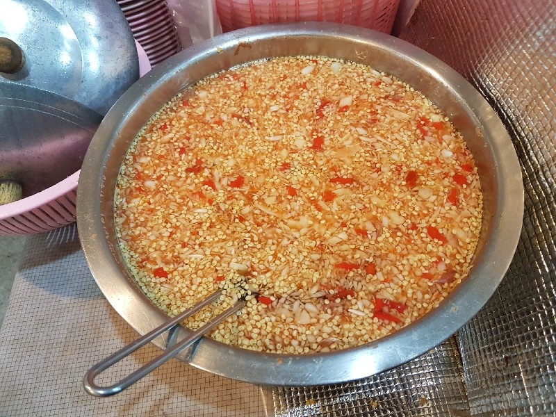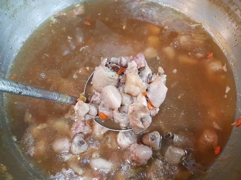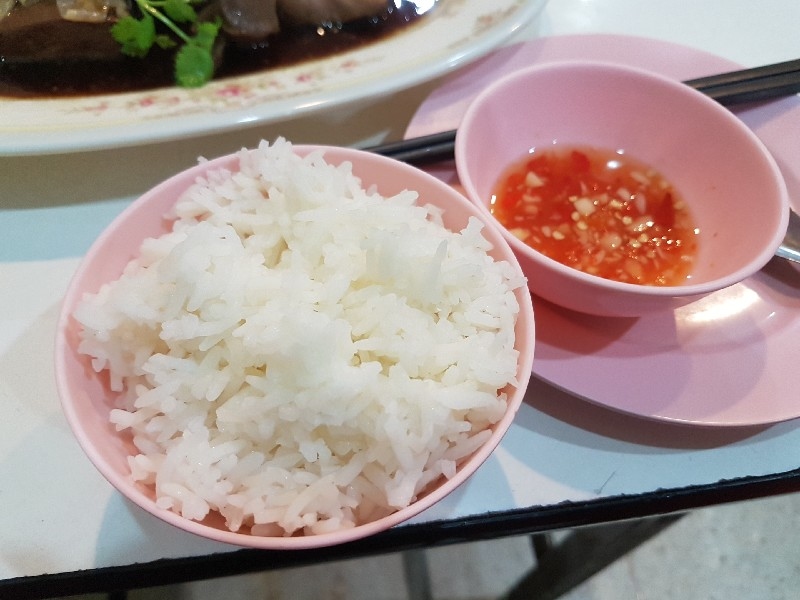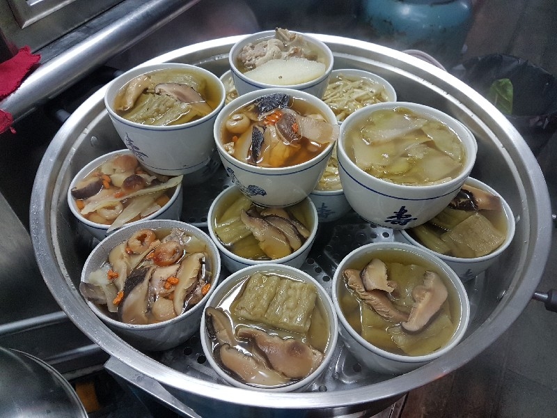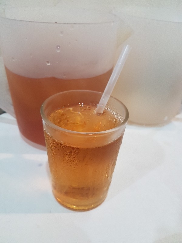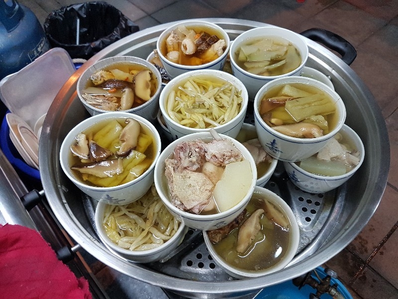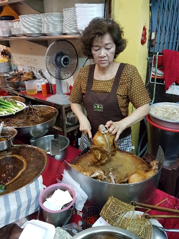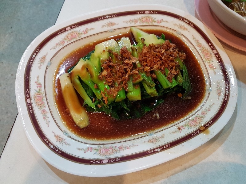 หนุ่มคนที่ยืนทำนั่นนี่ คล่องตัว ชื่อว่า “ อ้น ” ครับ โดยมีคุณแม่ ยืนช่วยและคอยกำกับอีกทีครับ แถบนี้ก็จะตั้งของอร่อย ๆ ไว้ยั่วตามากมาย กาละมังใส่เลือดเป็ดนี่ยั่วตามากครับ กาละมังถัดมา เป็นพระเอกในใจของชายกางเลยครับ เม่งซุ่ง ( หน่อไม้จีน ) ต้มเค็มใส่เห็ดหอม แนะนำว่าห้ามพลาดครับ ข้อไก่ตุ๋น เปื่อยมาก ตีนเป็ดพะโล้เปื่อย ๆ หอม ๆ ปีกเป็ด ที่สาวกขาเบิร์น ต้องชอบ เพราะดูด ๆ แทะ ๆ สุดจะเพลิน คะน้าลวก ที่นี่ ใส่ใจในการเตรียมคะน้าดีมากครับ ปอก ลอกเปลือก ลอกผิวที่แข็งออกจนเกลี้ยง ลวกมาสุกกรอบ เขียวสวยงามตลอดจนถึงจานท่านครับ ไส้แก้วพวงโต จะแขวนอยู่ที่ตู้โชว์ ใกล้มือหนุ่มอ้นครับ หม้อน้ำจิ้มใบโต ที่ขอบอกว่า อร่อยมาก ๆ รสจัดจ้านเฉียบขาดมากครับ ตรงหน้าเตานี้ เป็นเสมือนกองบัญชาการหลักครับ สองคนคุณแม่กับคุณลูกชาย ทำกันมิได้หยุดครับ ป้ายบอกราคาค่าอร่อยในแต่ละแบบที่ท่านชอบครับ สารพัดสำนักที่แวะเวียนมาร้านนี้ครับ น้ำชาจีนใส่น้ำแข็ง เสริฟมาเป็นเหยือกครับ สะใจดีแท้ เค้าคิดคนละ 10 บาทครับ ง่ายดี