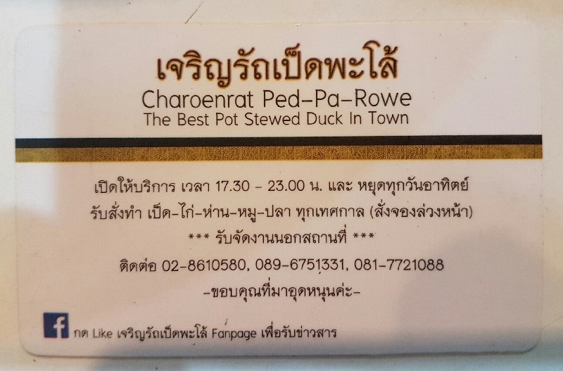 เวลาเรียกเก็บเงิน จะได้แค่ใบนี้มาบ้าง ไม่ได้บ้าง ทั้งหมดทั้งปวง ร้านนี้ได้การเลยครับ เป็ดพะโล้หอม เนื้อนุ่ม ไม่เหนียว เครื่องใน ไส้เป็ดอร่อยใช้การได้ สารพัดตุ๋น น่าสนใจมาชิมอีกให้ครบ ราคาน่าคบหาไว้ครับ เค้าเปิดทุกวันนะครับ หยุดเพียงวันอาทิตย์ครับ ให้บริการตั้งแต่ห้าโมงเย็น ถึงราวห้าทุ่มครับ จะสอบถามเส้นทาง ก็โทร.ถามได้ครับ