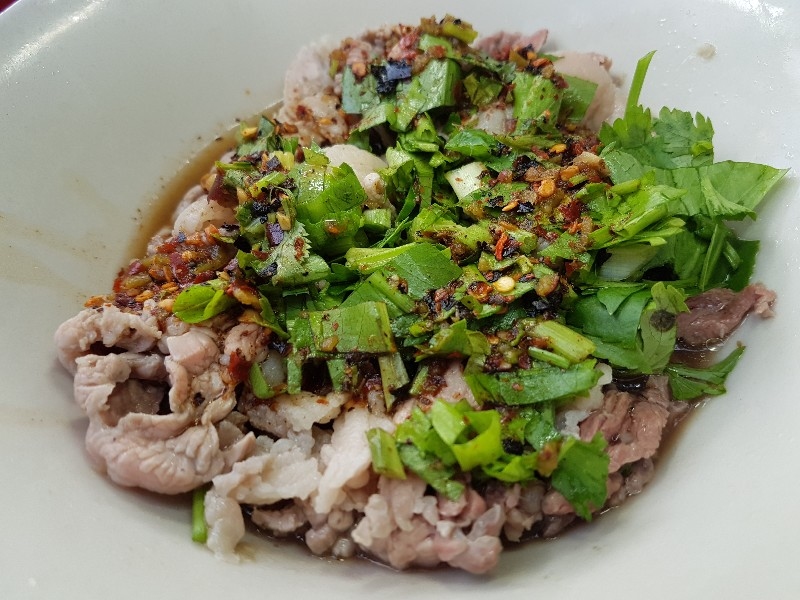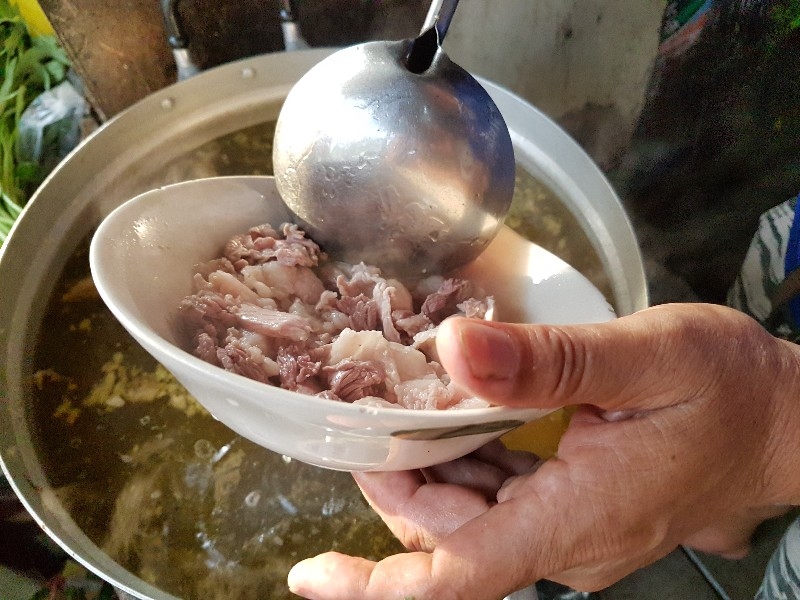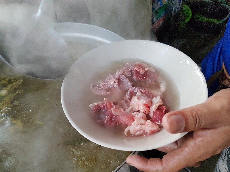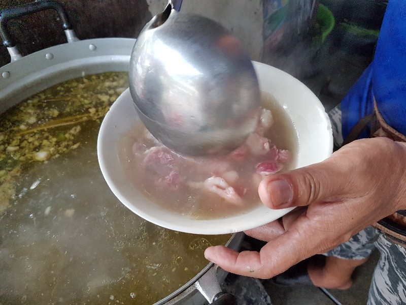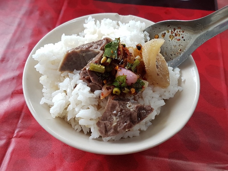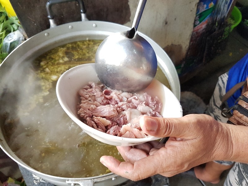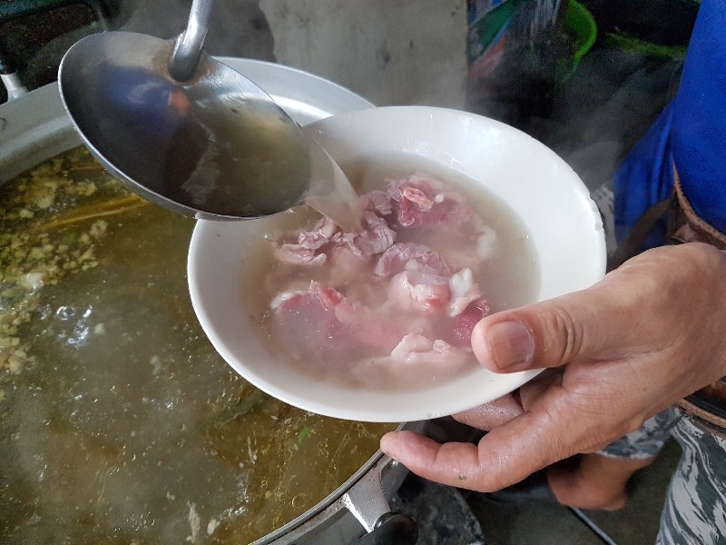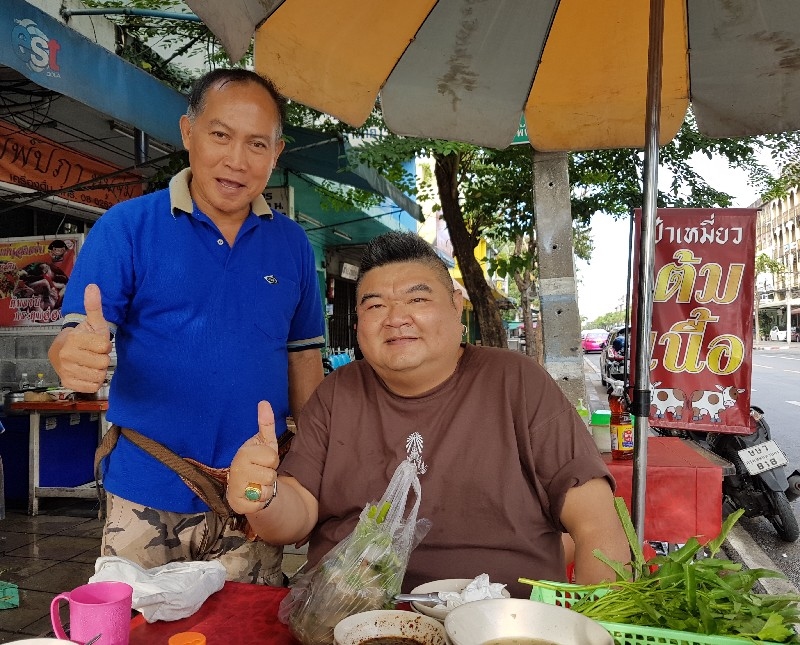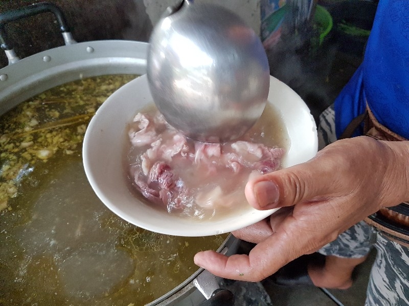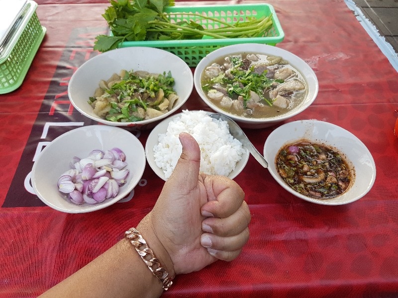 บางวัน ชายกางไปขอให้ป๋าเหมี่ยว ลวกเนื้อสดติดมัน แบบผ่านน้ำซุปร้อน ๆ ครั้งเดียวพอ เนื้อสดหั่นแล้ว ราดน้ำซุปร้อน ๆ ใส่ลงไป ใช้ทัพพีสับ ๆ ให้แตกตัวหน่อย โดนน้ำซุปร้อน ๆ ทั่วกัน รินน้ำออก เป็นอันใช้ได้ ใส่ผักโรย ราดน้ำจิ้มใส่ลงไปเลย ชายกางขอหอมแดงหั่นเพิ่มกลิ่น รสหน่อยครับ ใส่ดีลงไปหน่อย พอมีรสขมเบา ๆ พอเป็นเสน่ห์แห่งท้องทุ่ง คลุกให้ดี แล้วลองใส่ปากดูเถอะคุณเอ๋ย ข้างหน้าชายกาง มีรุ่นใหญ่ไฟกระพริบ นั่งหั่นหอมแดงกับกระเทียมใส่น้ำจิ้มอย่างมุ่งมั่น พี่เค้า เล่นบทโหดมากครับ น้ำจิ้มแจ่ว โกยมาแห้ง ๆ ใส่หอมแดงกับกระเทียมหั่นหนักมาก แกบอกว่า มันโคตรจะถึงใจเลยครับ ต้มเครื่องในของชายกางก็มาวางพอดี ยังแจ่มเช่นเดิม 80 บาทครับ ชายกางนำเรื่องราวของป๋าเหมี่ยว ลงใน FB คนตามมากินกันเยอะ จนต้องต้มเพิ่มอีกหม้อ เพิ่มของอีกเยอะเลย เพื่อรองรับลูกค้าที่ตามเฟสมา แถมเปิดตัวแฟนที่กลับมาช่วยป๋าเหมี่ยวขายของเข้าไปอีก ช่วงนี้ป๋าเลยอารมณ์ดี โลกสีชมพูไปโม๊ดเลยแหละ
