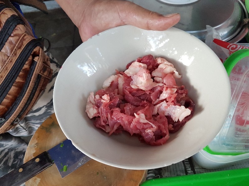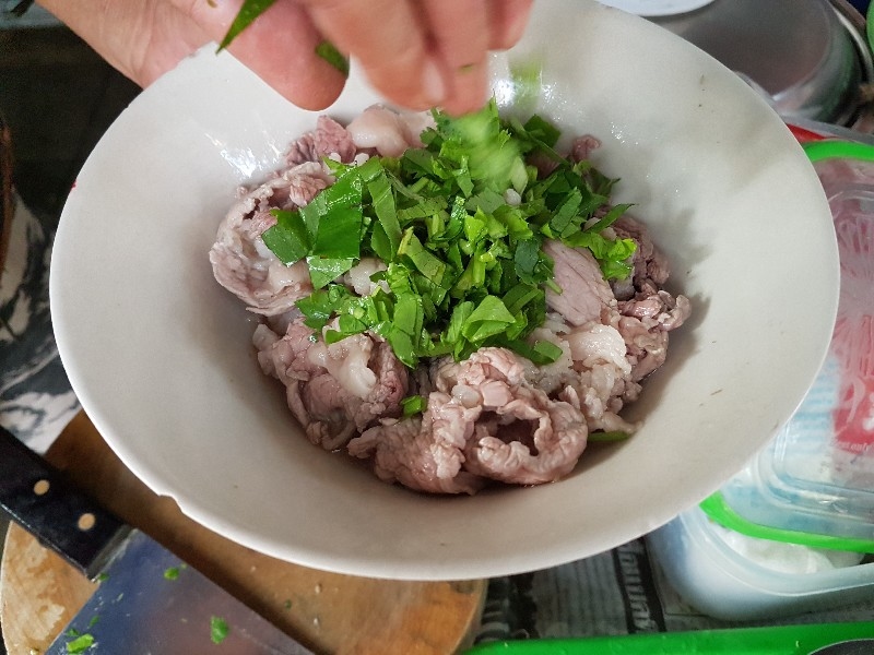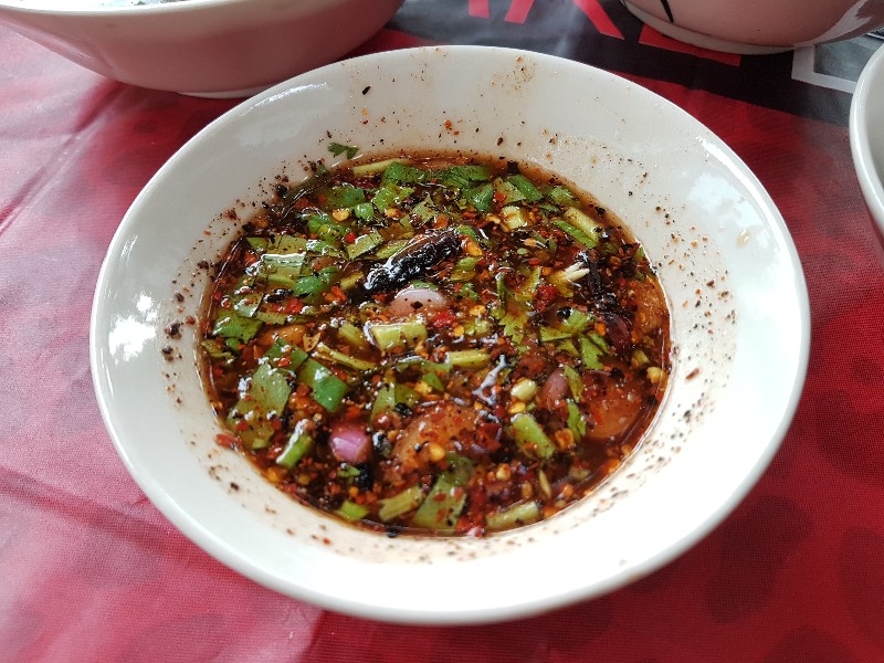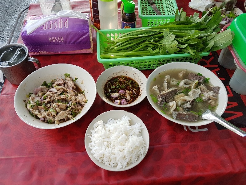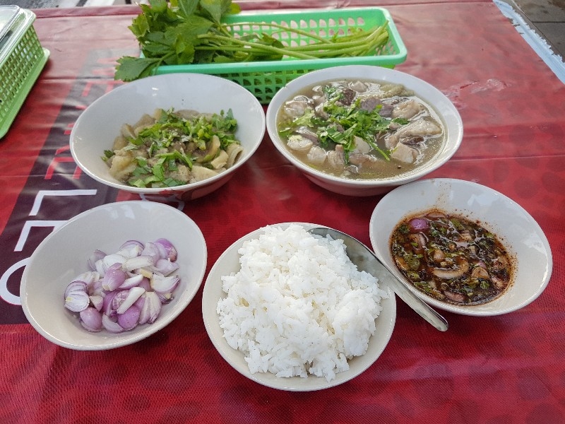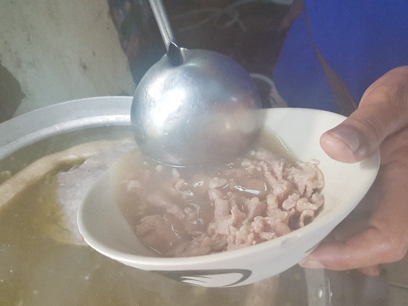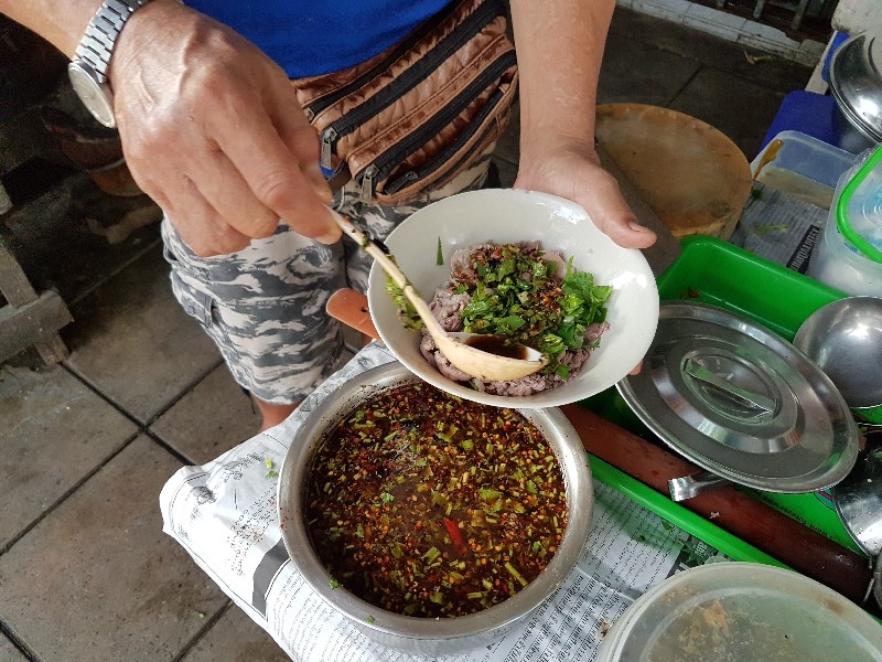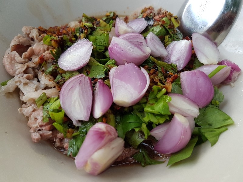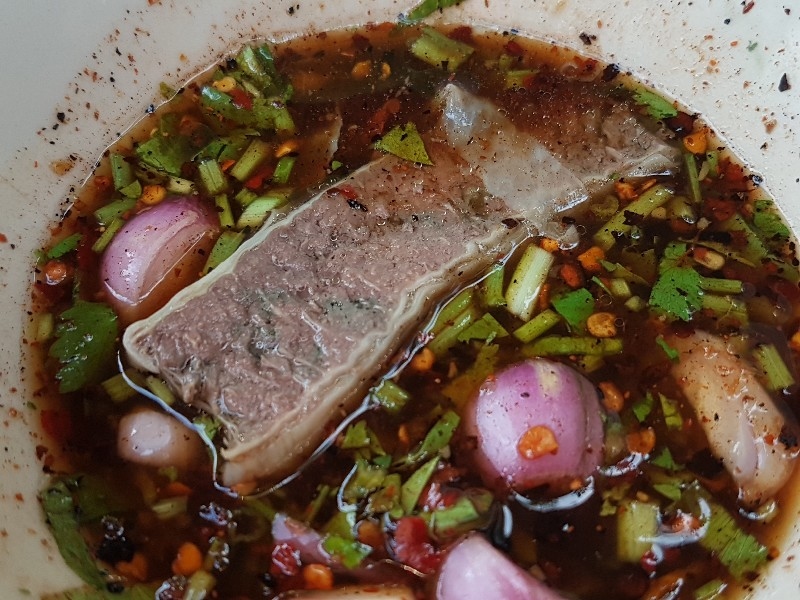บางวัน ชายกางไปขอให้ป๋าเหมี่ยว ลวกเนื้อสดติดมัน แบบผ่านน้ำซุปร้อน ๆ ครั้งเดียวพอ เนื้อสดหั่นแล้ว ราดน้ำซุปร้อน ๆ ใส่ลงไป ใช้ทัพพีสับ ๆ ให้แตกตัวหน่อย โดนน้ำซุปร้อน ๆ ทั่วกัน รินน้ำออก เป็นอันใช้ได้ ใส่ผักโรย ราดน้ำจิ้มใส่ลงไปเลย ชายกางขอหอมแดงหั่นเพิ่มกลิ่น รสหน่อยครับ ใส่ดีลงไปหน่อย พอมีรสขมเบา ๆ พอเป็นเสน่ห์แห่งท้องทุ่ง คลุกให้ดี แล้วลองใส่ปากดูเถอะคุณเอ๋ย ข้างหน้าชายกาง มีรุ่นใหญ่ไฟกระพริบ นั่งหั่นหอมแดงกับกระเทียมใส่น้ำจิ้มอย่างมุ่งมั่น พี่เค้า เล่นบทโหดมากครับ น้ำจิ้มแจ่ว โกยมาแห้ง ๆ ใส่หอมแดงกับกระเทียมหั่นหนักมาก แกบอกว่า มันโคตรจะถึงใจเลยครับ ต้มเครื่องในของชายกางก็มาวางพอดี ยังแจ่มเช่นเดิม 80 บาทครับ ชายกางนำเรื่องราวของป๋าเหมี่ยว ลงใน FB คนตามมากินกันเยอะ จนต้องต้มเพิ่มอีกหม้อ เพิ่มของอีกเยอะเลย เพื่อรองรับลูกค้าที่ตามเฟสมา แถมเปิดตัวแฟนที่กลับมาช่วยป๋าเหมี่ยวขายของเข้าไปอีก ช่วงนี้ป๋าเลยอารมณ์ดี โลกสีชมพูไปโม๊ดเลยแหละ